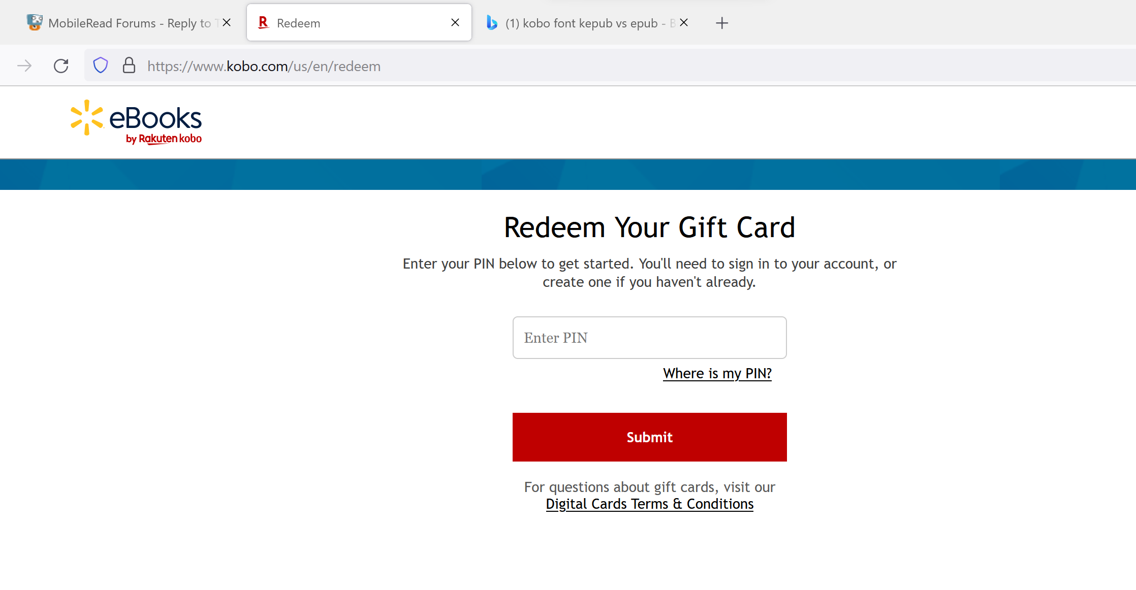 Does anyone know if there's a way to use WalMart gift cards to buy eBooks from the Kobo shop? I saw in the Kobo store's help page somewhere, it said you could use them. So I got a $5 digital card from MyPoints, and I can't get it to work. It's a 16-digit number with a 4-digit PIN. At the Kobo page, if I click "Gift Cards" at the top, and then "Redeem Kobo Card", it says "enter your PIN", and just says "Oops! Something went wrong. Please try again later." Doesn't matter if I put the 16-digits, or the 4-digits, or all 20-digits. If I fill up my shopping cart and try adding the gift card at the payment page, the loading icon pops up and just spins forever and nothing happens. I'm on a Windows PC using Firefox, BTW, but I've tried some other desktop browsers as well. So I went to WalMart's online store, decided to try to use two $5 gift cards to buy one $10 Kobo gift card. I didn't think it would let me, but the payment went through and everything, and then I received an email: "Sorry, we had to cancel your order Unfortunately, order [number] was flagged due to location restrictions on placing and shipping orders. As a result, we had to cancel the order. We're sorry for any inconvenience this causes." I'm in the US? I don't know what this means. Nothing on the website, that I could see, suggested that only certain locations could purchase Kobo gift cards. The last thing I tried, I saw a post here on the forum, someone mentioned something about linking their WalMart account to their Kobo account, but as far as I can tell, it didn't do anything for me. Anyway, I'll probably just give up and trade them to someone else for some PayPal, but if anyone knows how to make it work, that would be cool. |