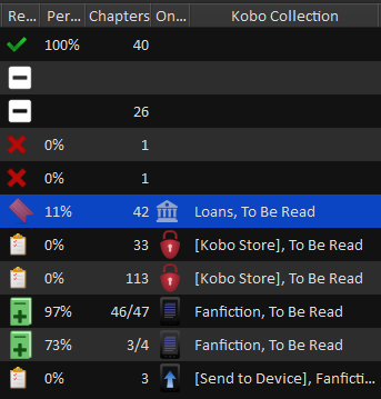 But, I'm probably little better.Mine is a bit simpler. In my case, I overlay the percent read column that is fetched from calibre. I think it started by putting a tick in that column and not displaying the number. And then added the other icons. I currently have: