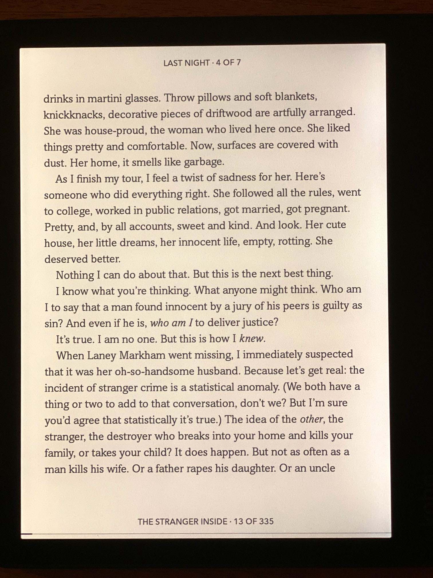 This photo is very critical. The impression when holding the ereader in hand is more uniform. I guess the light is coming from the right. It is just a bit brighter there. The few areas of shade at the top and bottom right are a bit exaggerated in this picture. In reality they are almost invisible. |