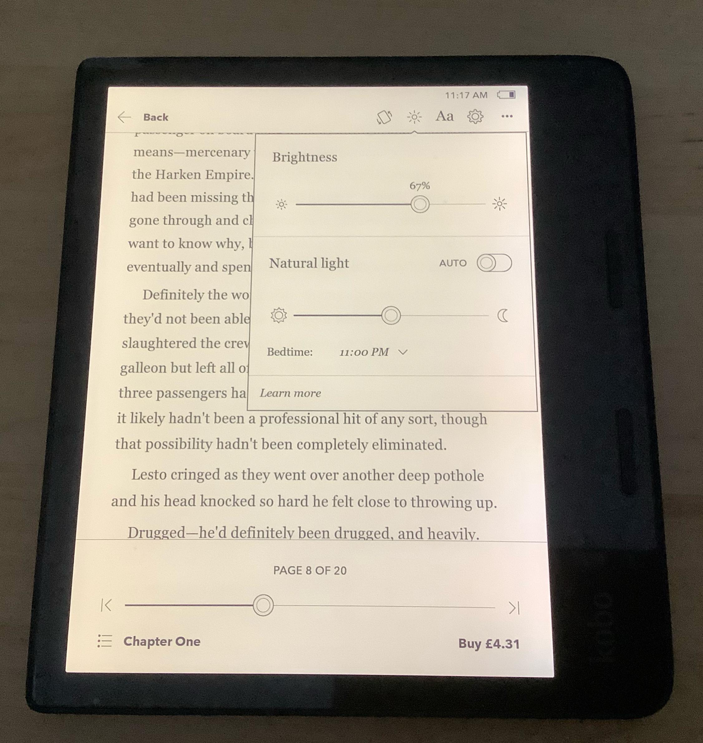 Here’s it after the reset at 67% brightness and half natural light. It seems to be a bit better but I can’t get past the jagged line of white on the right. Whilst I like the warm light I like a whitish screen in daylight and the warm light on auto in the evening and at night.