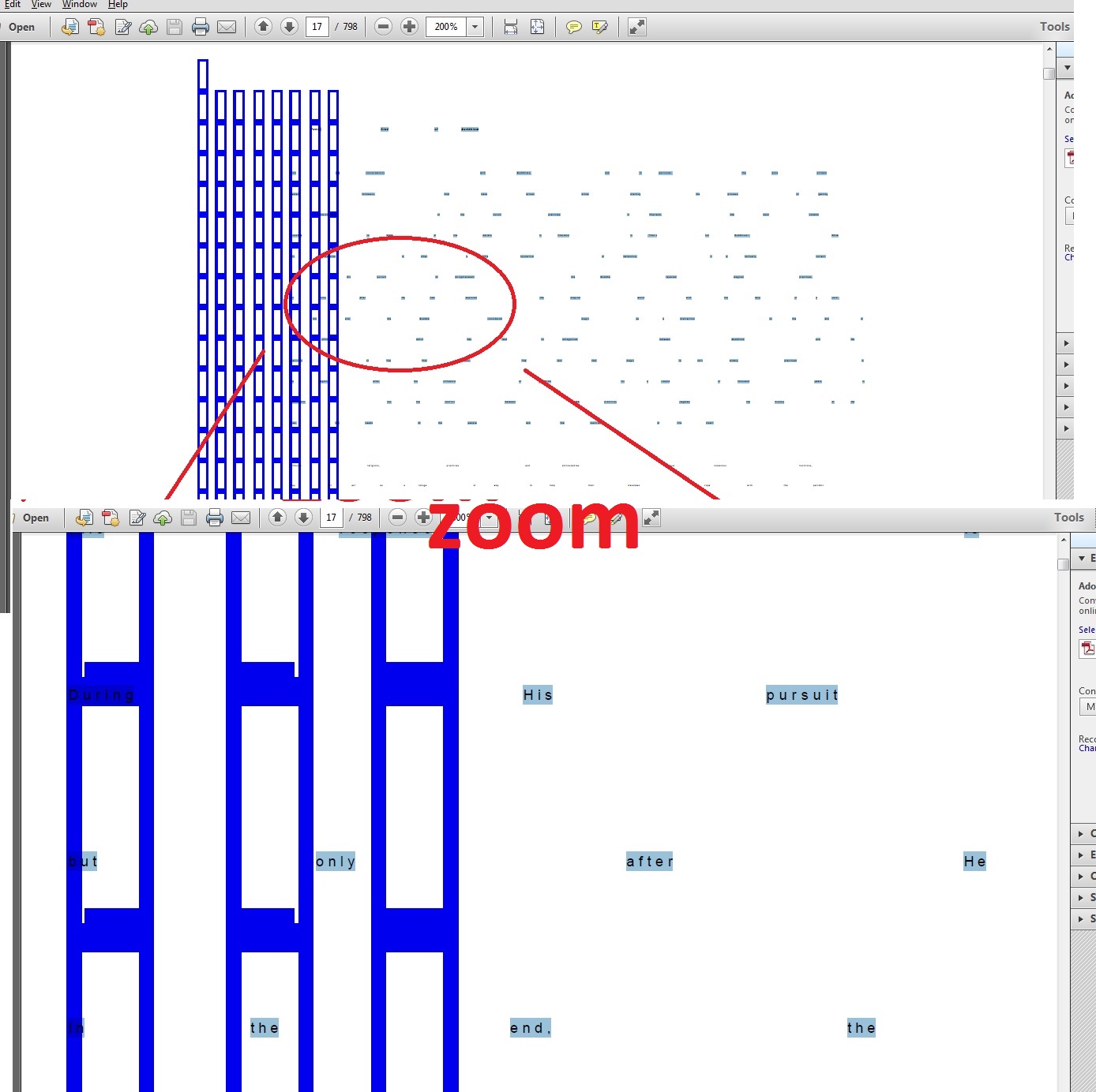 I found many comments for using Calibre so I'm trying it. One of the books I have in my PC amazon reader I want to convert for PDF because it's size, near 580 pages Letter size (really big) with more than 330 photos too and the Azw file is some 56Mb. Sadly the printed version was very limited and is no longer available, I tried contacting the author but he says has no plan for another edition. It's a copyrighted book and I know the author, so for sure this is really for private use. My setup: PC computer, Intel Core I5, 16Gb RAM, two 2Tb HDs running Windows 7 Ultimate. Calibre takes near 30 hours working, RAM usage goes to the maximum and the result appears really strange, I tried PDF and AZW3 output with the same results. I also tried Docx but after more than 40 hours I canceled the work as it still was at 67% only. The attached image show what we see. Appears gibberish at first, but an extreme Zoom in the PDF Adobe reader shows the words are there, but very little and with a lot of spaces. The blue squares appear only in the PDF, the AZW3 shows the same very small text, but not the squares. Also, as I found another "gibberish" problem in this forum, I tried to edit the generated AZW3, but there's no TTFs nor something else, just the same as we see in the code bellow. I observed the .CSS também, just confirm Calibre found each word to be something different and generate such thing. I did not find the option to upload one of the generated Html from the work areas, so I will just copy part of that, and we see the generated code is really strange, with a new "style" for every word. (part of one html page bellow): ["style","position:absolute;top:9367.2px;left:1166. 23px;"]]},{"n":"span","x":"The ","a":[["id","_idTextSpan5503"],["class","CharOverride-22"],["style","position:absolute;top:9367.2px;left:1262. 95px;letter-spacing:4.2px;"]]},{"n":"span","x":"Sacred ","a":[["id","_idTextSpan5504"],["class","CharOverride-22"],["style","position:absolute;top:9367.2px;left:1557. 79px;letter-spacing:4.8px;"]]},{"n":"span","x":"and ","a":[["id","_idTextSpan5505"],["class","CharOverride-22"],["style","position:absolute;top:9367.2px;left:2087. 13px;letter-spacing:4.2px;"]]},{"n":"span","x":"The ","a":[["id","_idTextSpan5506"],["class","CharOverride-22"],["style","position:absolute;top:9367.2px;left:2389. 66px;letter-spacing:4.2px;"]]},{"n":"span","x":"Profane","a":[["id","_idTextSpan5507"],["class","CharOverride-22"],["style","position:absolute;top:9367.2px;left:2684. 5px;letter-spacing:4.8px;"]]}]},{"n":"p","l":"\n\t\t\t","a":[["class","Basic-Paragraph ParaOverride-1"]],"c":[{"n":"span","x":"For ","a":[["id","_idTextSpan5508"],["class","CharOverride-11"],["style","position:absolute;top:10056.4px;left:28.3 5px;letter-spacing:5.4px;"]]},{"n":"span","x":"a ","a":[["id","_idTextSpan5509"],["class","CharOverride-11"],["style","position:absolute;top:10056.4px;left:382. 43px;letter-spacing:3.6px;"]]},{"n":"span","x":"better ","a":[["id","_idTextSpan5510"],["class","CharOverride-11"],["style","position:absolute;top:10056.4px;left:552. 21px;letter-spacing:6.17px;"]]},{"n":"span","x":"understanding ","a":[["id","_idTextSpan5511"],["class","CharOverride-11"],["style","position:absolute;top:10056.4px;left:1118 .18px;letter-spacing:6.69px;"]]},{"n":"span","x":"of ","a":[["id","_idTextSpan5512"],["class","CharOverride-11"],["style","position:absolute;top:10056.4px;left:2415 .16px;letter-spacing:4.8px;"]]},{"n":"span","x":"the ","a":[["id","_idTextSpan5513"],["class","CharOverride-11"],["style","position:absolute;top:10056.4px;left:2642 .16px;letter-spacing:5.4px;"]]},{"n":"span","x":"occult ","a":[["id","_idTextSpan5514"],["class","CharOverride-11"],["style","position:absolute;top:10056.4px;left:2976 .46px;letter-spacing:6.17px;"]]},{"n":"span","x":"system ","a":[["id","_idTextSpan5515"],["class","CharOverride-11"],["style","position:absolute;top:10056.4px;left:3552 .36px;letter-spacing:6.17px;"]]},{"n":"span","x":"in ","a":[["id","_idTextSpan5516"],["class","CharOverride-11"],["style","position:absolute;top:10056.4px;left:4228 .1px;letter-spacing:4.8px;"]]},{"n":"span","x":"Thailand, ","a":[["id","_idTextSpan5517"],["class","CharOverride-11"],["style","position:absolute;top:10056.4px;left:4441 .91px;letter-spacing:6.48px;"]]},{"n":"span","x":"it ","a":[["id","_idTextSpan5518"],["class","CharOverride-11"],["style","position:absolute;top:10056.4px;left:5309 .67px;letter-spacing:4.8px;"]]},{"n":"span","x":"is ","a":[["id","_idTextSpan5519"],["class","CharOverride-11"],["style","position:absolute;top:10056.4px;left:5476 .55px;letter-spacing:4.8px;"]]},{"n":"span","x":"important ","a":[["id","_idTextSpan5520"],["class","CharOverride-11"],["style","position:absolute;top:10056.4px;left:5683 .42px;letter-spacing:5.76px;"]]},{"n":"span","x":"to ","a":[["id","_idTextSpan5521"],["class","CharOverride-11"],["style","position:absolute;top:10296.4px;left:28.3 5px;letter-spacing:4.8px;"]]},{"n":"span","x":"separate ","a":[["id","_idTextSpan5522"],["class","CharOverride-11"],["style","position:absolute;top:10296.4px;left:260. 1px;letter-spacing:6.4px;"]]},{"n":"span","x":"the ","a":[["id","_idTextSpan5523"],["class","CharOverride-11"],["style","position:absolute;top:10296.4px;left:1085 .42px;letter-spacing:5.4px;"]]},{"n":"span","x":"spirits ","a":[["id","_idTextSpan5524"],["class","CharOverride-11"],["style","position:absolute;top:10296.4px;left:1424 .47px;letter-spacing:6.3px;"]]},{"n":"span","x":"from ","a":[["id","_idTextSpan5525"],["class","CharOverride-11"],["style","position:absolute;top:10296.4px;left:2012 .15px;letter-spacing:5.76px;"]]},{"n":"span","x":"the ","a":[["id","_idTextSpan5526"],["class","CharOverride-11"].... etc. No idea if this has a solution. Thanks in advance. |