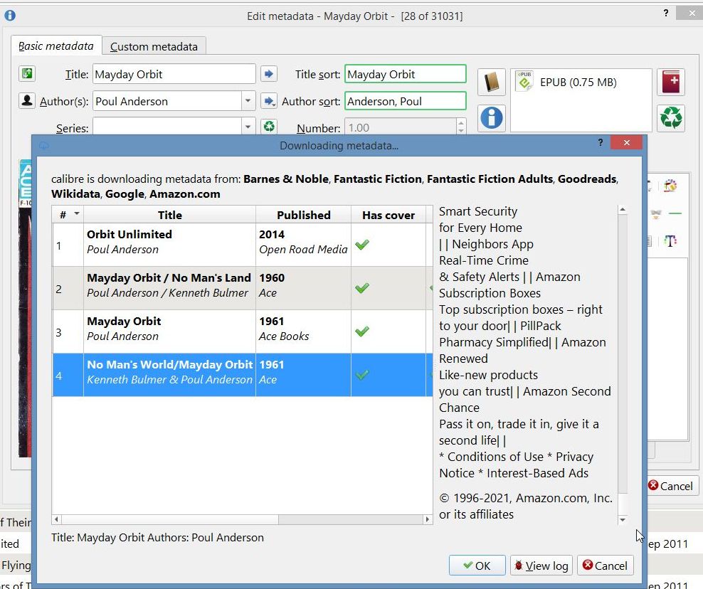 Author: Poul Anderson Title: Mayday Orbit (Old Ace double book from the 60s) Comes back with 4 entries, \ 1`obviously wrong. 1 from Goodreads, (includes entire goodreads page) 1 from Google & Amazon with no description info 1 from Amazon (also includes entire amazon page) So I am not sure whats going on with my system. |