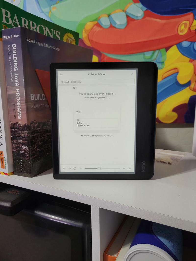 Last month, Rakuten finally released a reasonably-sized Kobo with USB C, the Kobo Sage. One of the most fascinating things about the Kobo eReaders (compared to the Kindle eReaders) is that they run a user-modifiable version of Linux, meaning you're free to do all sorts of weird and wild things with them. So I decided to put Tailscale on my Kobo Sage. Tailscale is distributed as statically-compiled binaries (thanks Go!), so getting Tailscale downloaded and running on Kobo Sage was as easy as downloading the binaries, copying them into a $PATH friendly folder, and running tailscaled. Code: