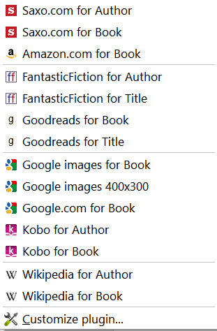 perhaps the 4 options (Amazon, Goodreads, Google, and Wikipedia) could be defined as 'resources' that can be overridden in the usual way.As a minimalist I try to have as few plugins as possible, I've whittled it down to eight. BR |
