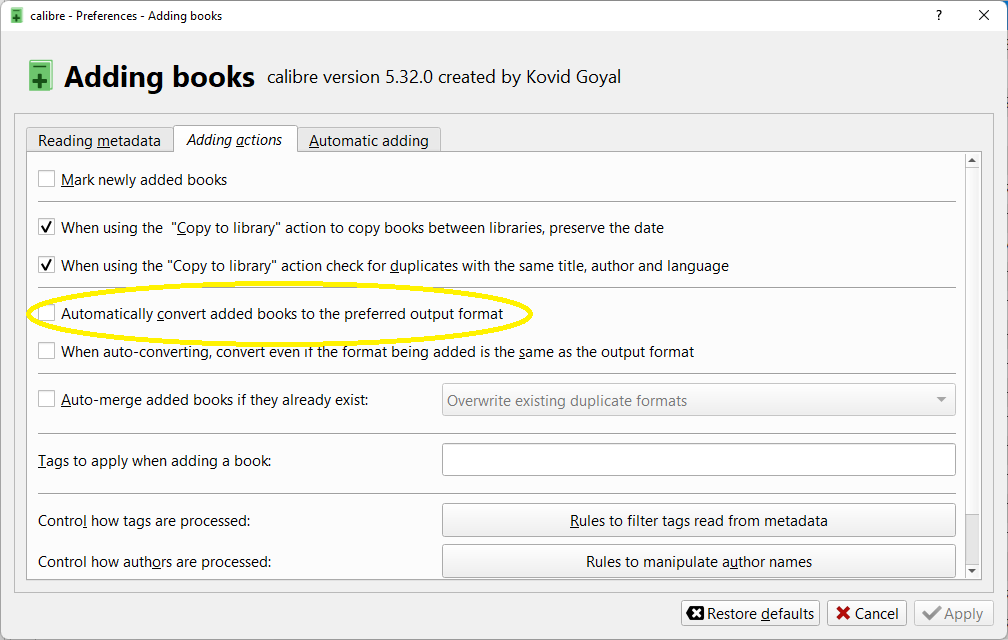 Checking, files download by K4PC or K4Mac are downloaded as .azw and calibre will rename them as .azw3 or .mobi on import. Files downloaded by Download and Transfer via USB are downloaded as .azw3 or .mobi (depends on your device, old devices will always get .mobi). One possibility that comes to mind is that in Preferences, under Behavior, you have your default output format set to .mobi AND under Add books => Adding Actions, you have enabled Automatically convert added books to the preferred output format on import. See the two images for those settings. Last edited by DNSB; 12-02-2021 at 11:19 PM. |