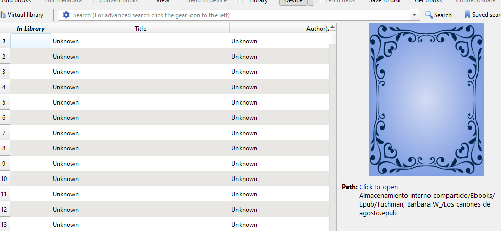 calibre.devices.errors.DeviceError: Failed to fetch the file ('Almacenamiento interno compartido', 'Ebooks', 'Epub', 'Rowling, J. K_', 'Harry Potter', 'HP - 02 - Harry Potter y la camara secreta.epub') with error: