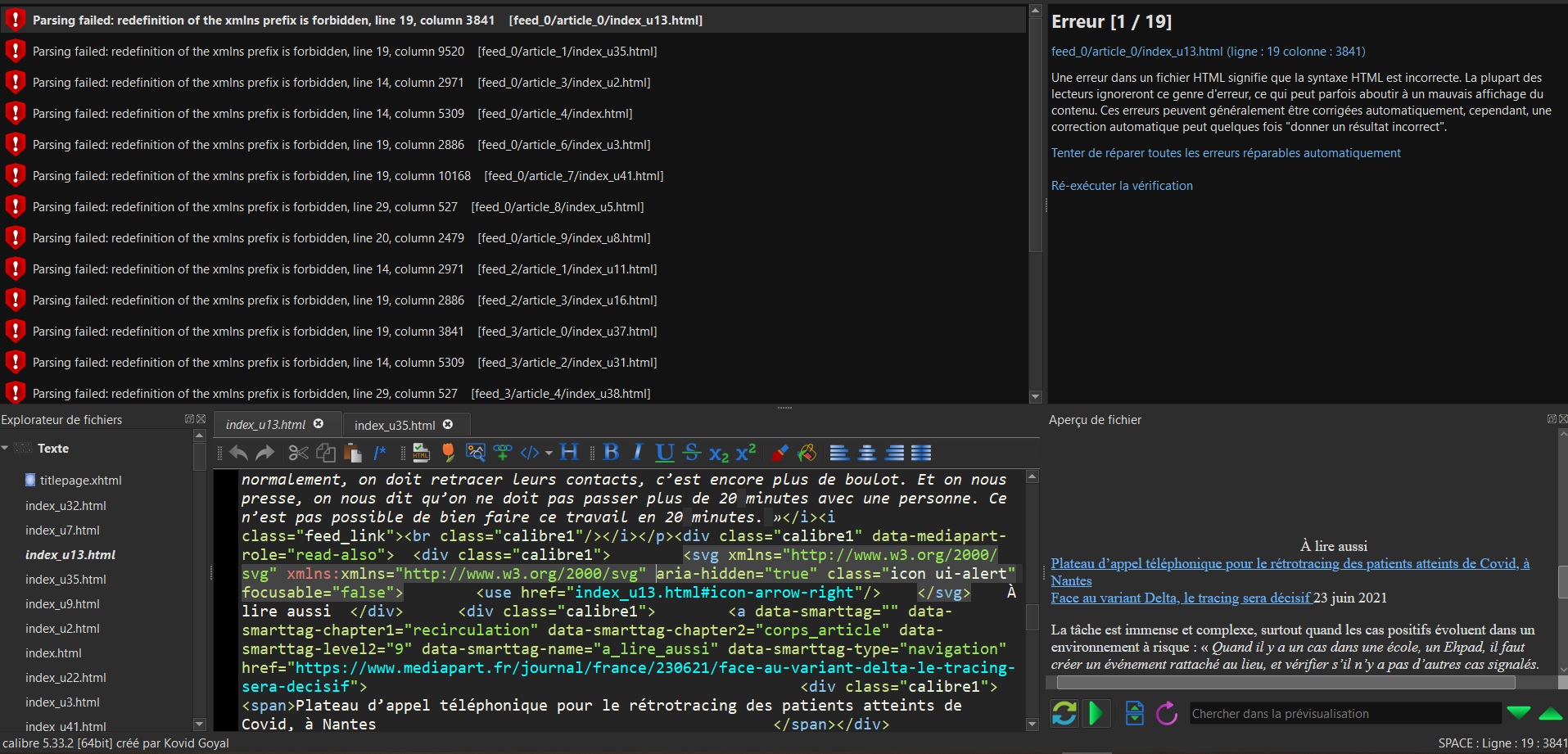 It always cut just before the links to other articles ("à lire aussi"). Kepub conversion didn't help so I ran a book check and got 19 "Parsing failed: redefinition of the xmlns prefix is forbidden" errors (screen attached). Here's the full recipe : Spoiler: