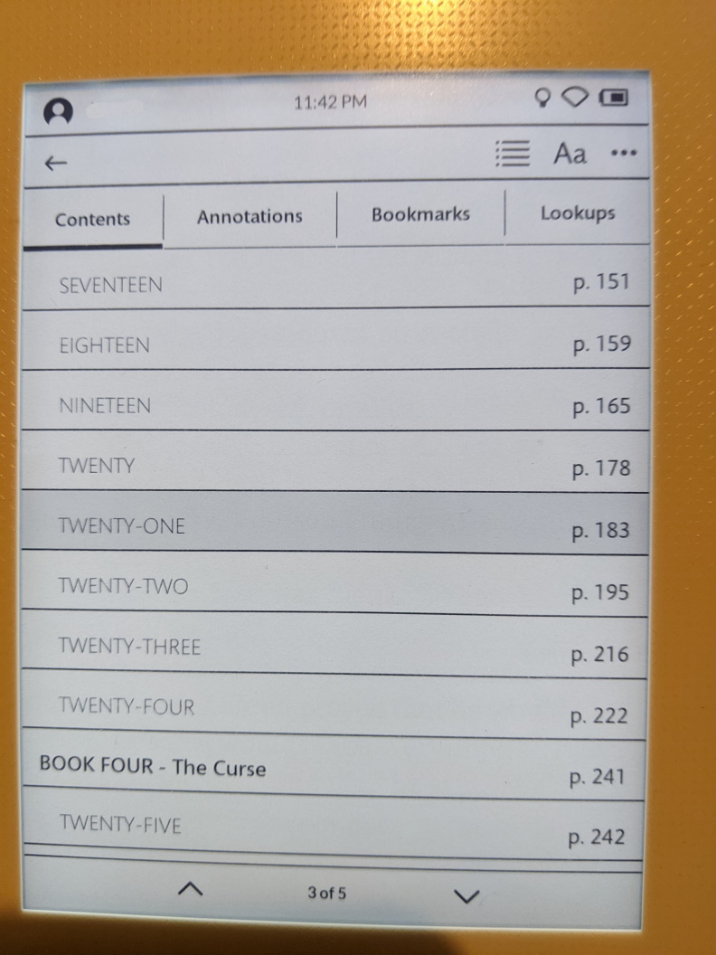 My current book has h2 tags (for the 'books') and h3 tags (for the chapters). The h2 links are black. See attached photo (and please forgive the bizarre color correction. My GL Plus has a white bezel. Why it's yellow in the photo is a mystery.  |