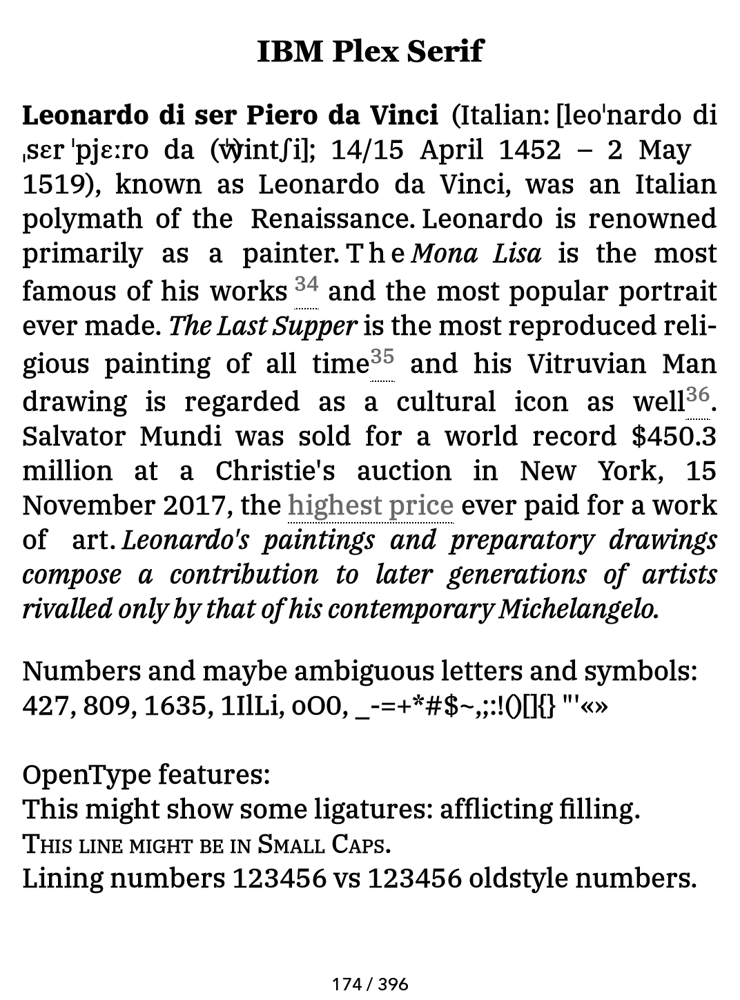 The kepub I generated works ok in Nickel, but RMSDK couldn't handle the epub. I was interested in seeing the RMSDK output because Nickel is pretty bad at handling kerning and it does funny things with most fonts when displaying the "[leoˈnardo diˌsɛr ˈpjɛːro da (v)ˈvintʃi]" part of the text. See the difference between Baskerville 10 Pro and IBM Plex Serif in the attached screenshots.