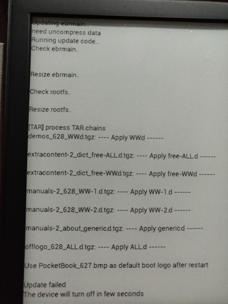 I've got exact same problem as was described here but with Touch Lux 5. Update to version 6.5.1089 went fine but 2 days later my PocketBook show me that there is a newer firmware 6.5.1433. After updating procedure there was info on the screen "Update failed The device will turn off in few seconds". Even if I manually put swupdate.bin (no matter if it is old 6.5.1089 or new 6.5.1433) update is failing all the time and touchpad not working anymore. hwconfig show device_touchpanel=22 if that helps. What can I do to solve it? |
