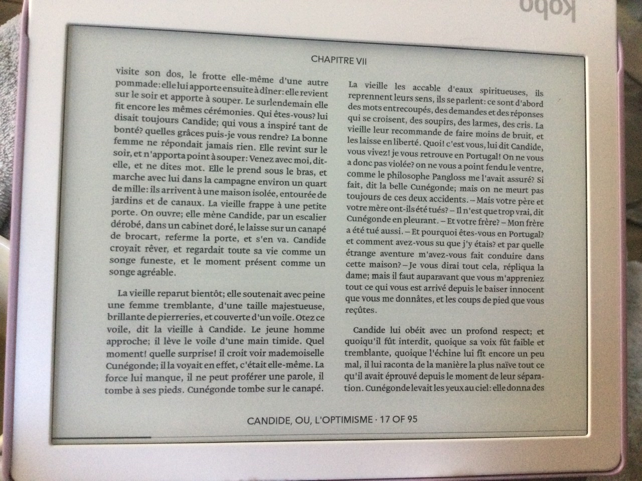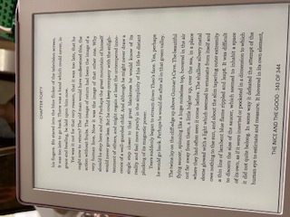 This picture illustrates why avoiding widows and orphans is so important to me. And it also looks as if (apart from that issue with the book I posted about earlier) the config file edit has resolved my issues. Previously when I read epubs in this two page layout, one side was usually shorter than the other, and now, it just looks perfect.