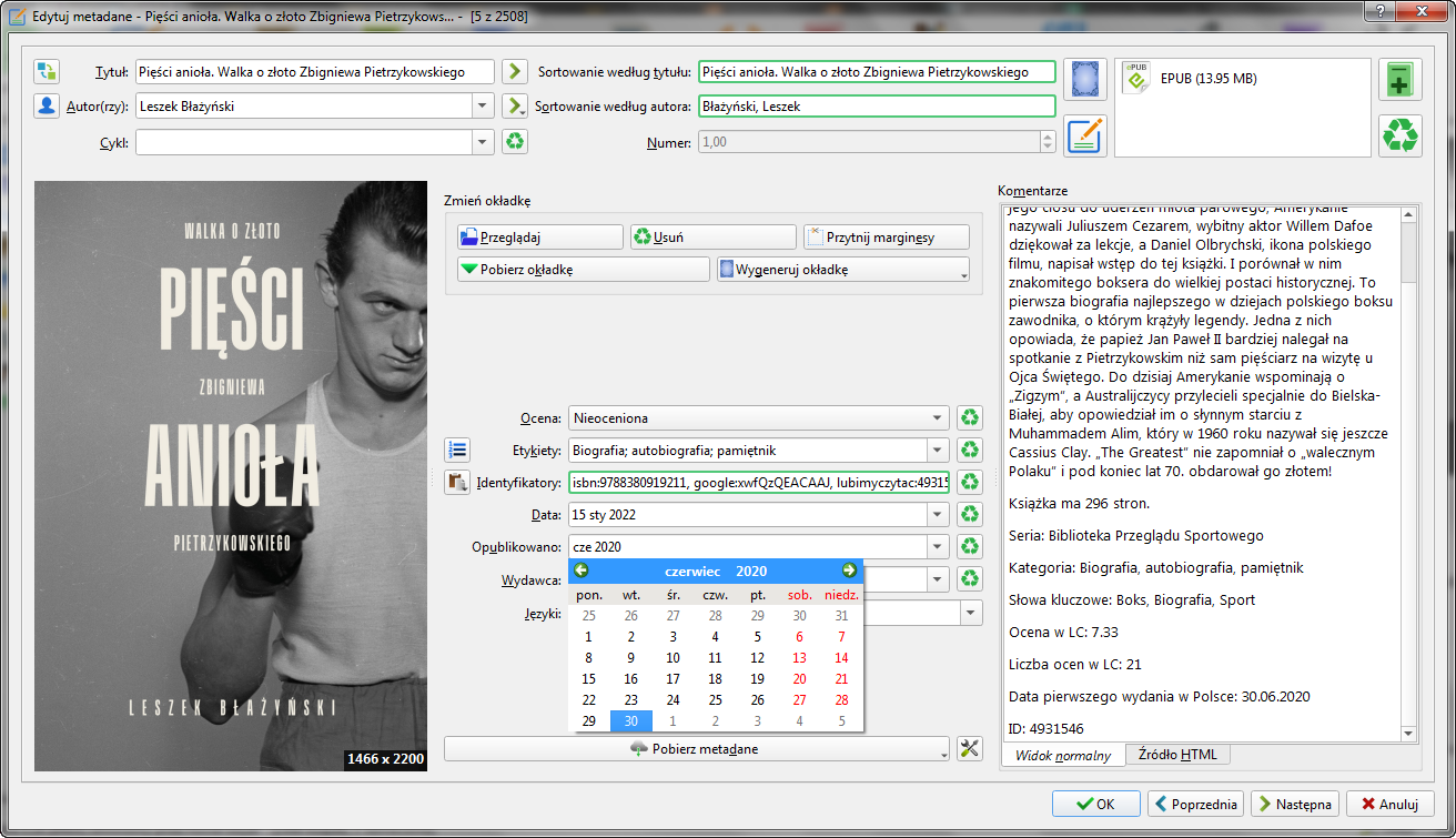 Trochę powalczyłem z oprogramowaniem, a mianowicie odinstalowałem i zainstalowałem wtyczkę, odinstalowałem calibre v5.34 i zainstalowałem ostatnią "kompatybilną" v4.23, i nadal to samo. Problem jest w innym miejscu... i wygląda na jakieś "czary": Chciałem dokonać zrzutu ekranu przy pomocy programu FastStone Capture i taki oto skutek: - pierwszy zrzut ekranu (z błędem - 15 styczeń): - drugi zrzut ekranu (bez błędu - 30 czerwiec) :Oczywiście przy kolejnym użyciu wtyczki (np. chęć wykonania trzeciego zrzutu ekranu) błąd... powrócił tzn. 15 stycznia zamiast 30 czerwca. Nawiasem mówiąc, można zauważyć kolejny błąd w tytule. Zamiast kropki w pierwszym obrazku tym z błędem daty widać błędny zapis tytułu książki - dwukropek zamiast kropki po "Pięści anioła", czyli między tytułem a podtytułem książki. Co ciekawe programu do zrzutów używam bardzo sporadycznie, więc pewnie nie ma kluczowego znaczenia. Najprawdopodobniej błąd jest związany z komputerem i jego oprogramowaniem. Generalnie błąd nie spędza mi snu z oczu i da się z nim żyć, po prostu trzeba sobie manualnie poprawić datę. ps. oto zapis z dziennika Quote: