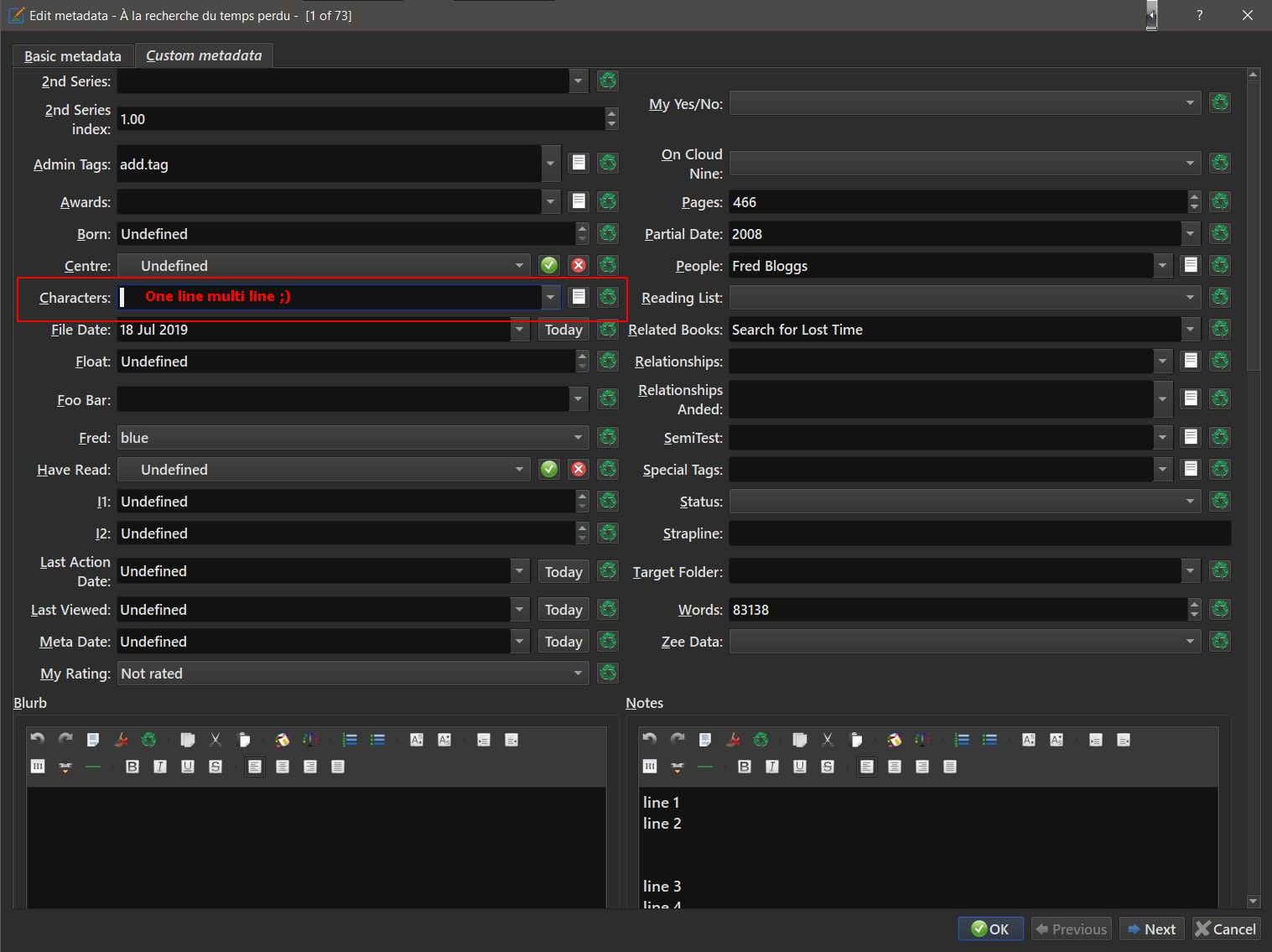 ![]() Another wish list item. In book lists I hide long text columns with an 'is set' icon, and to avoid horizontal scrolling I shrink the column widths accordingly, and I often give such columns a 2 character Header name. It would be good if columns had a another 'label' (e.g. Column title) which if present would be used in Book Details, Metadata Edit etc. In this screen shot the Red labels in the Book details panel are Column titles for my #blurb and @checklist columns. As always - only if its easy-ish ![]() BR |