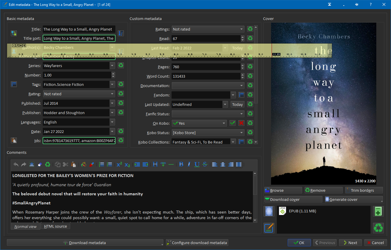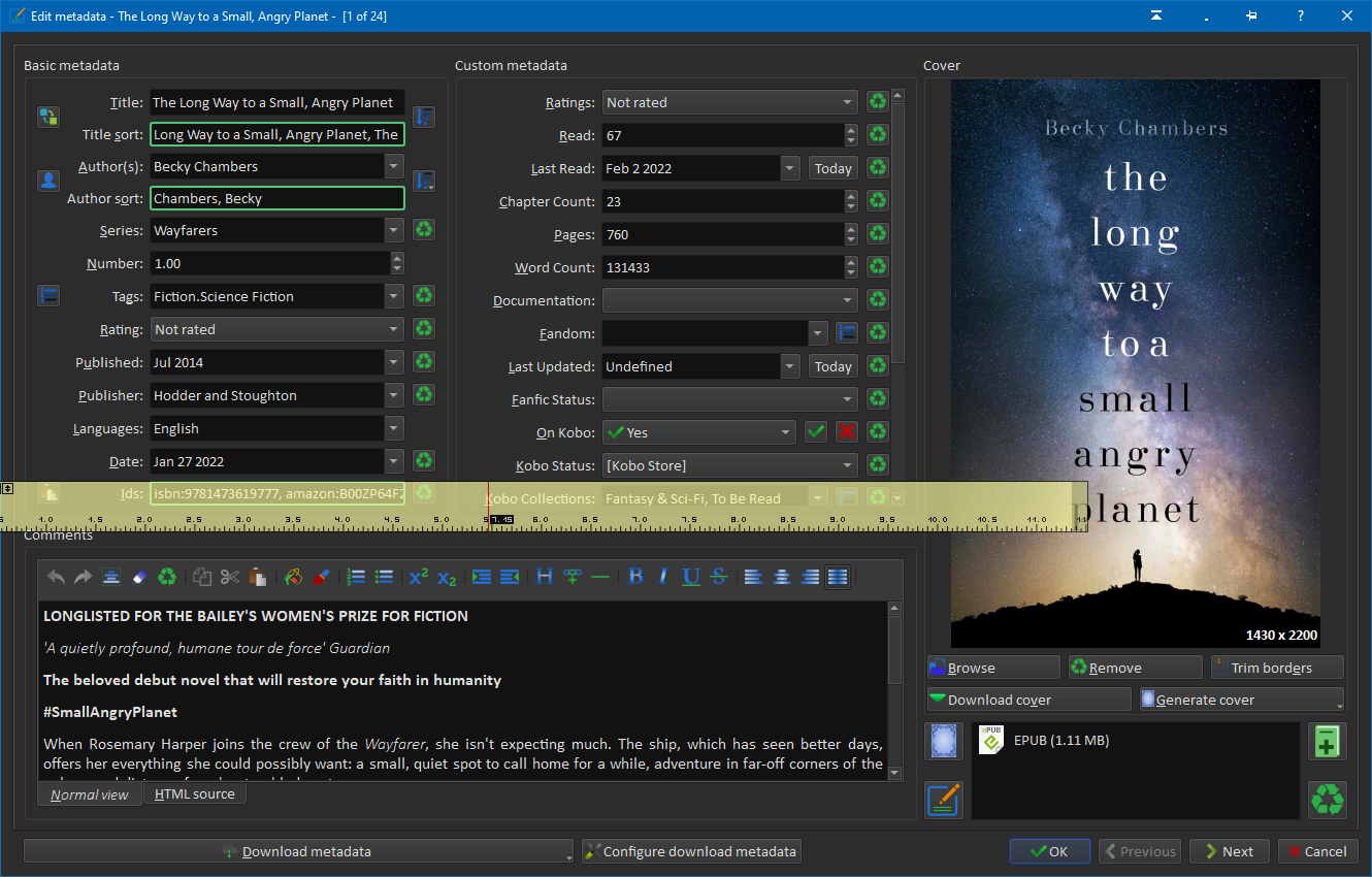 ![]() Small question: In one-tab mode, is there a way to fix the "Kobo Collections" clipping at the bottom here? Resizing the window just makes the comments area bigger, and I can't resize the sections individually. ![]() seems to be a bit of misalignment too on the lower columns -- are dropdown fields a slightly different height or something? Last edited by ownedbycats; 02-03-2022 at 12:23 AM. |