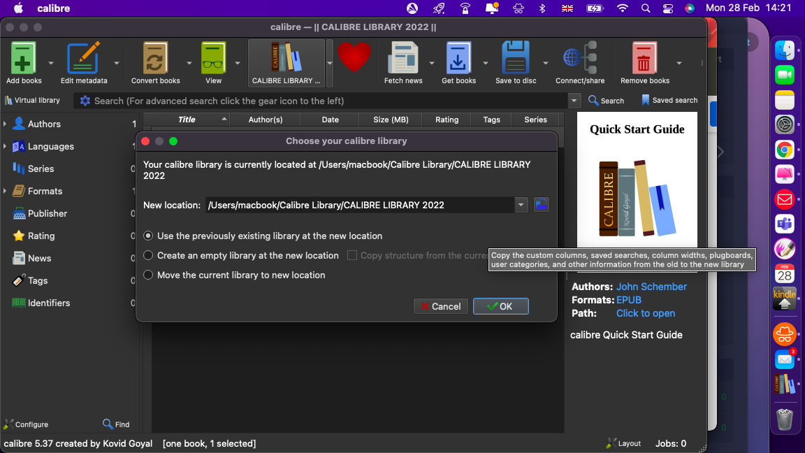 I have installed (wonderful) Calibre on this new MacBook, and now need to move my Library here. I have tried finding my existing Library, and moving it to a new folder, but Calibre rejects every folder that I create. Can any kind person give me VERY simple instructions ?