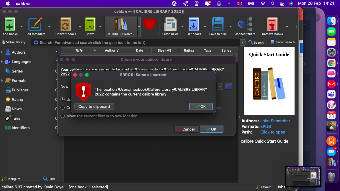 When I try to Switch/Create Library, I choose an empty subfolder. When I click OK, I am told that the subfolder cannot be. used. I attach screen-captures that I hope may make my predicament clear.