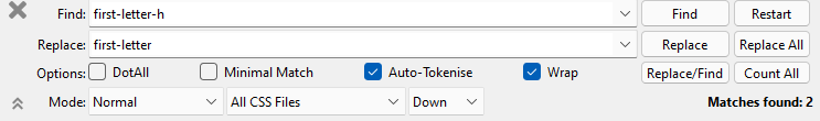 Using the version from message #11, I'm finding one oddity. In an eub I was editing, I wanted to search in both CSS files for 'first-letter-h'. So I entered 'first-letter-h' in the find box, set the file selection to All CSS files, and clicked find. No Matches found was returned. Now I clicked on Count All and it returned 2. This was with the focus on a .xhtml files. I then opened one of the CSS files and Find and Count All both found two instances. On the other hand, if I have a CSS file open and select search in All HTML files, the search works as expected.