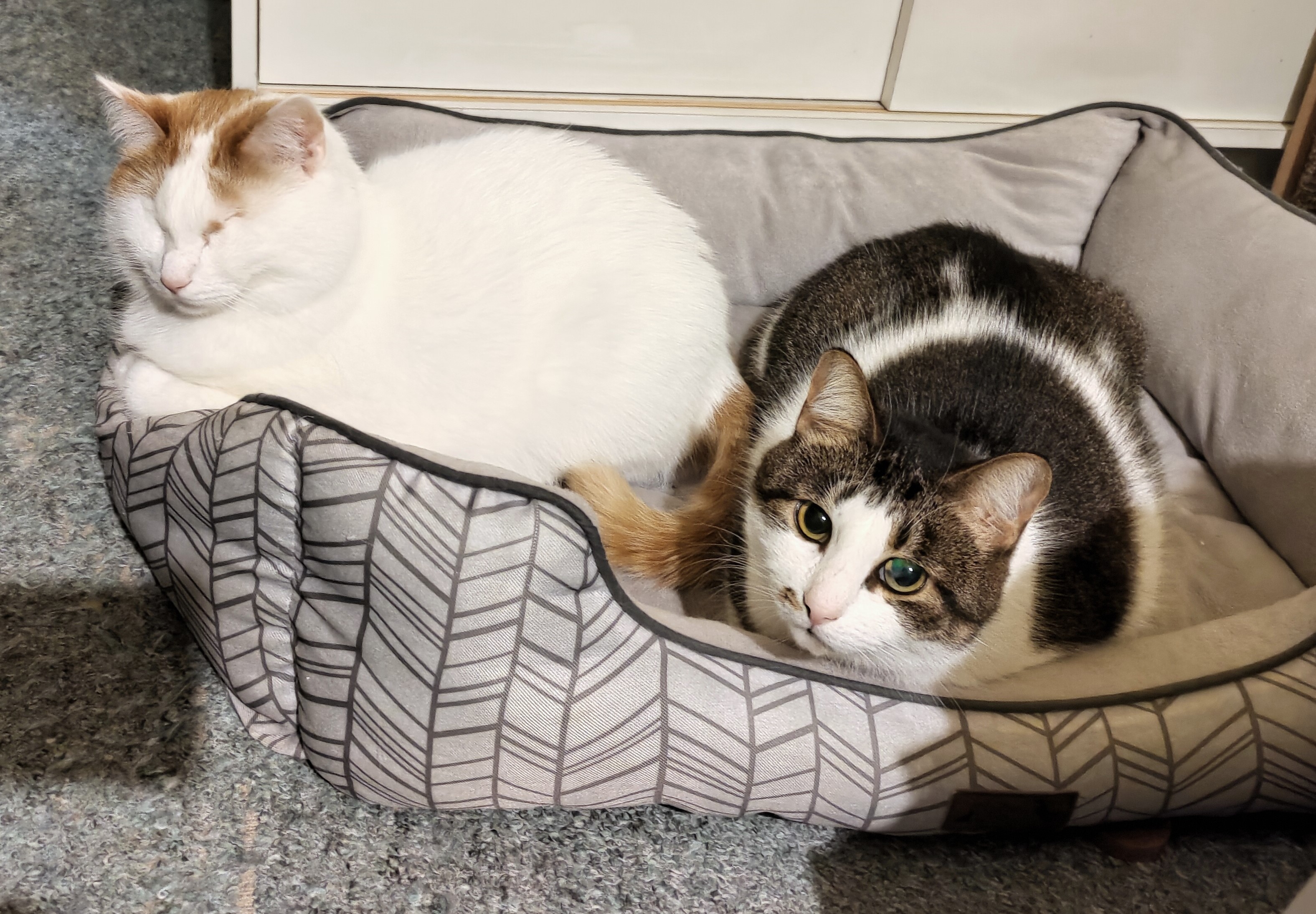 Gretta is still timid, but likes petting and is slowly getting more used to me and her new home. Vallu has already gotten used to the new girls and isn't unduly bothered by them. |