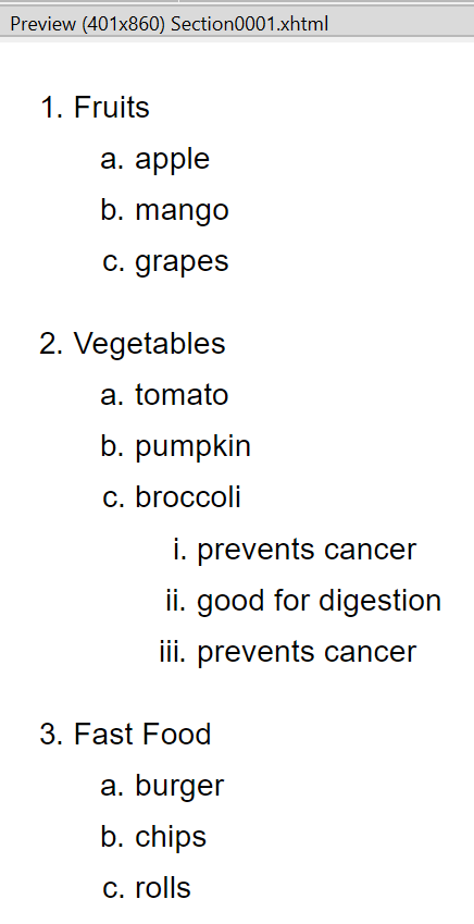 @KevinH, I had googled for the multi level lists and did apply the code. Although all was good the Sigil popped errors in EPUBcheck. This is what I had added: <ul> <li>Line-1</li> <li>Line-2</li> <li>Line-3 <p></p> <ol style="list-style-type: lower-alpha; padding-left: 0;"> <li style="margin-left:2em">Sub-Line-1</li> <li style="margin-left:2em">Sub-Line-2</li> <li style="margin-left:2em">Sub-Line-3</li> </ol> <p></p> </li> <li>Line-1</li> <li>Line-2</li> <li>Line-3 <p></p> <ol style="list-style-type: lower-alpha; padding-left: 0;"> <li style="margin-left:2em">Sub-Line-1</li> </ol> <p></p> </li> <li>Line-1</li> <li>Line-2</li> <li>Line-3</li> </ul> ----------------------------------------------------------------------------------- @Turtle91 this code below worked and now I don't see errors except the one at the end of this message. <html xmlns="http://www.w3.org/1999/xhtml"> <head> <title></title> <style type="text/css"> .lvl1 {list-style-type: decimal} .lvl2 {list-style-type: lower-alpha} .lvl3 {list-style-type: lower-roman} .lvl1 li {margin-top:1.5em} .lvl2 li {margin-top:.5em} .lvl3 li {margin-top:.5em} </style> </head> <body> <ol class="lvl1"> <li>Fruits <ol class="lvl2"> <li>apple</li> <li>mango</li> <li>grapes</li> </ol> </li> <li>Vegetables <ol class="lvl2"> <li>tomato</li> <li>pumpkin</li> <li>broccoli <ol class="lvl3"> <li>prevents cancer</li> <li>good for digestion</li> <li>prevents cancer</li> </ol> </li> </ol> </li> <li>Fast Food <ol class="lvl2"> <li>burger</li> <li>chips</li> <li>rolls</li> </ol> </li> </ol> </body> </html> --------------------------------------------------------------------------------------- I have one code that is still bothering me but does show up in the EPUB check. <h2 id="sigil_toc_id_75">External things that add to the stress.</h2> Its every where in my file. How do I solve this? Regards. |