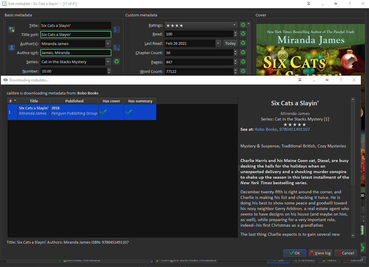 It has become so routine that I tend to mix and match the metadata download - I prefer the books to have the covers match the copy I bought from Kobo, but I also prefer not having to continually change the series number. |