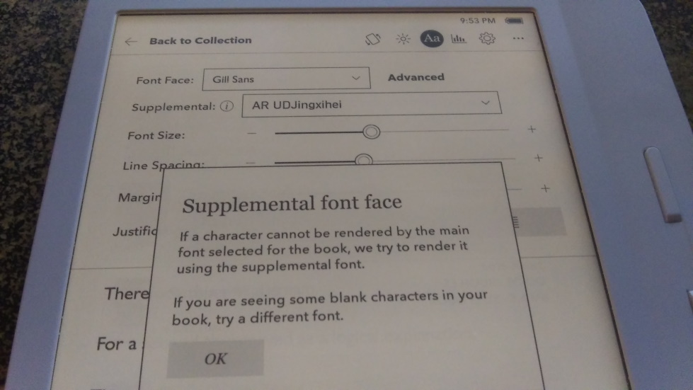 You can also change the font from the advanced settings but only to the default fonts (I’ve not checked if this changes if you patch). I’m not sure off hand if the fonts I’ve side loaded are otf or ttf, nor do I know if this would make a difference. Edit apparently my Libra 2 was on 4.31. Odd since I swear I’d updated to 4.31 already, and upon a sync tonight it told me there was an update. It’s very peculiar since I’d patched using 4.31s update and patches which I’d not have thought would have had much affect on 4.30. Maybe I’d downgraded at some point and don’t remember but I don’t have 4.30 patches on my computer and it was definitely patched. It also definitely updated because it’s now not patched. So I’m pretty perplexed. But at least this clears up why I’m not seeing advanced settings for kepub and you are. Last edited by MGlitch; 04-14-2022 at 11:07 PM. |