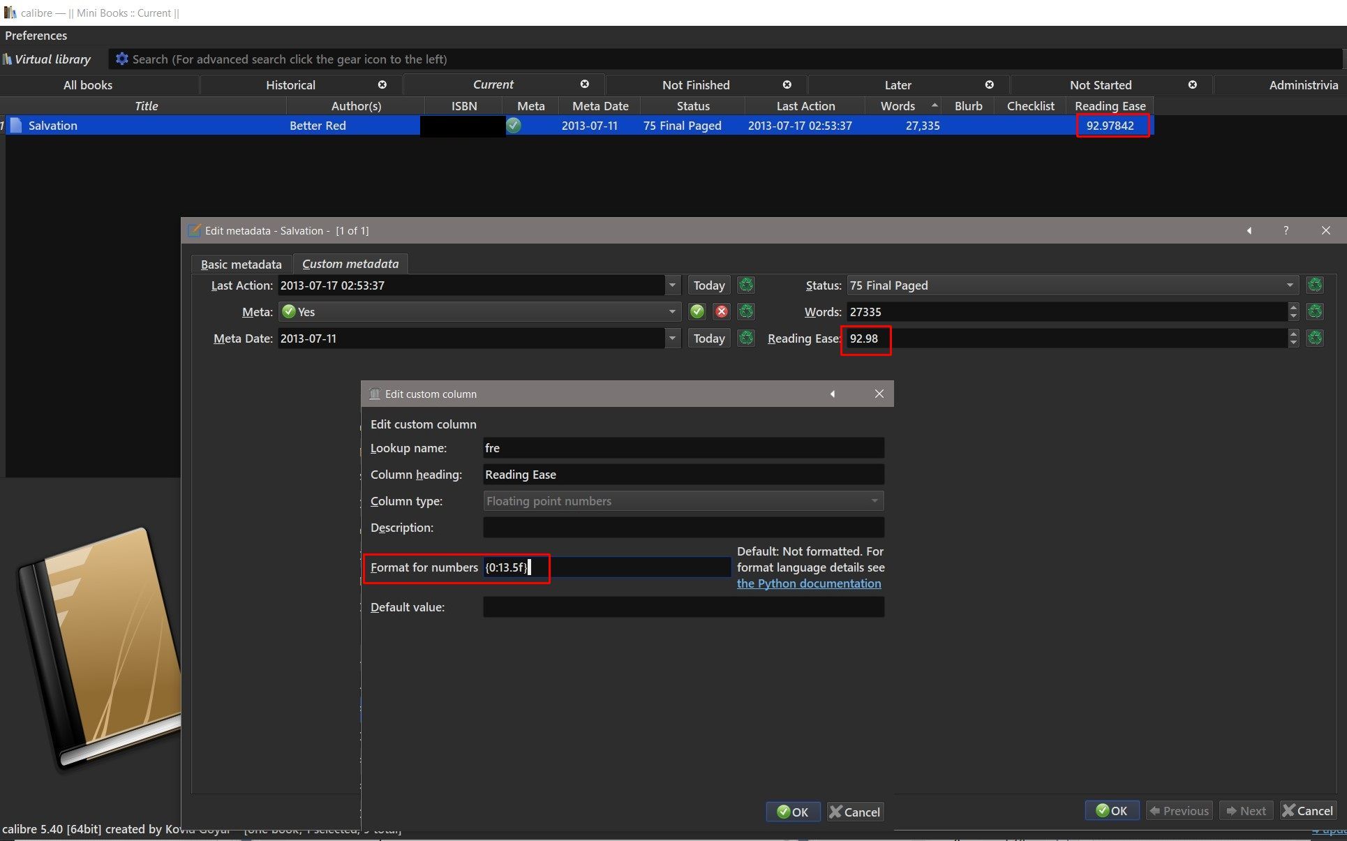 I feel like I am missing something very basic here: I’ve added a custom column with Column Type “Floating point numbers”, but I can only enter a max of two decimal places via the GUI. However, when I write directly to the database via a plugin/script, the field is capable of holding many more (e.g. when setting the custom column to format {0:.13f}, I can see precision to 13 decimal places).