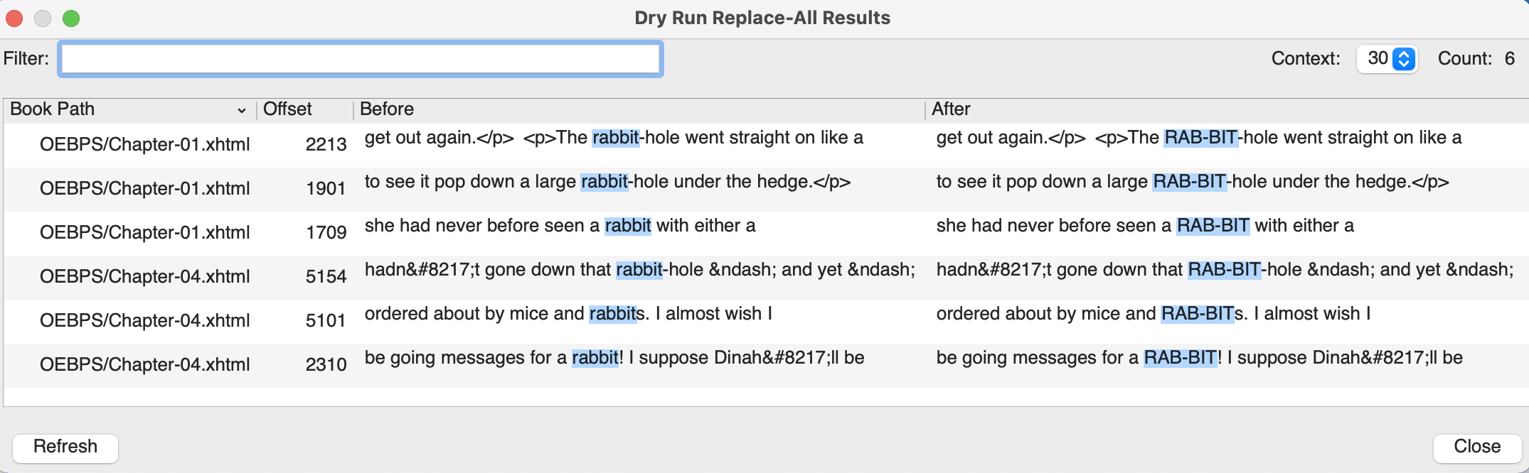 To conserve screen real-estate for those users still using lower resolution monitors and laptops, we redesigned the Find Replace dialog to minimize its width as that in turn determines the minimum width of CodeView and the resulting width of the main window. This involved moving the advanced Regex options into their own menu, replacing the text based buttons with universal icons, and re-ordering rows. In many languages the old text based buttons and advanced options names took up considerable and precious space. This change to use icons on buttons in turn freed up enough space to allow a new "Text" checkbox be added that when checked will limit the search to text outside of xhtml tags (one of our heavily requested features). See Attached: FindReplace-Dialog.png The screenshot above shows the new layout with the new Text checkbox. The next image shows how to access the Advanced Regex checkable menu options: See Attached: FindReplace-Adv-Options.png The meaning of each new icon is explained below. In addition, the way to launch two new additional FindReplace tools: "Dry-Run Replace All" and the "Filter Replacements" are also shown. Tooltips have been fully updated in case the user ever has any doubts. Filter Replacements (Delete Unwanted Matches) This tool helps users use Find and Replace All more effectively. It lists all of the matches found in context and shows their replacement in that same context. The amount of context both before and after a match (in characters) can be controlled by the user. See Attached: Filter Replacements.png If the user sees a match that is unwanted - i.e. they do not want that replacement to be made, they can select that match's row in the table and use the delete key or select delete on the pop-up menu to remove it. When all unwanted matches have been found and deleted, the user can then use the "Apply Changes" button to have just the changes remaining in the table made. This tool can by launched by Shift clicking on the Replace-All button. Dry-Run Replace All Often when crafting regular expression for Find and Replace, it is difficult to know if your find string will properly detect the cases you want while excluding the cases you do not want. This table shows the results of a trial dry-run of your current find and replace terms in context. No actual replacements/changes are ever made. Similar to the earlier dialog, the amount of context both before and after a match (in characters) can be controlled by the user. This tool can by launched by Shift clicking on the Count-All button. See Attached: Dry-Run-Replace-Dialog.png This allows the user to safely experiment with their search terms to see which if any would be most effective. Any row in the table can be double-clicked and the exact context for that particular match will be brought up in CodeView for the user to examine in more detail or to edit. This way a user can verify that a find replace all sequence will do exactly what they expect it to do. If the user makes changes to the underlying text that will impact the table, the user can click on the "Refresh" button at any time to force the table to be rebuilt. Notes Before anyone gets in an uproar over these changes, please note that these buttons are svg files that can be completely replaced and controlled by the user by using their own Sigil custom theme. This includes the ability to put back the buttons using text inside the svg for their chosen language. See Sigil IconThemes repo on GitHub for details on how to custom theme the icons used by Sigil. Versions of these icons suitable for those who prefer the fluent or material themes have already been made and included. Special Thanks A very special **Thank You** goes to our own BeckyEbook for designing and creating all of these new icons in versions suitable for main, fluent, and material themes and donating them to Sigil. Her many and varied contributions to Sigil has helped Sigil immensely and is greatly appreciated. Also a big "Thank You" goes to our own Doitsu for all of his testing and feedback of these interface changes. Last edited by KevinH; 05-05-2022 at 10:44 AM. Reason: minor fixups |