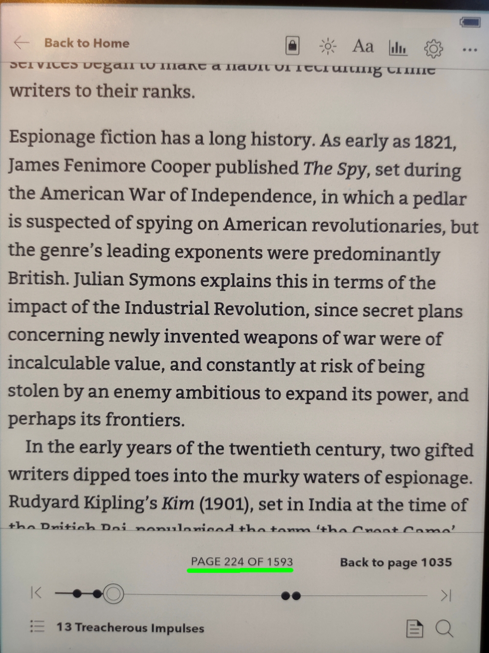 I mentioned that fact 2 different renderers offered very similar progress percentages was evidence (imo, ofc) that they were more reliable than the "% figure shown on the sleeping display (and in the book stats under "Activity") I have been further intrigued to discover an unexpected trend - the gap is getting BIGGER the further I go into the book. I had thought that as I progressed through the book, the 2 divergent stats would move toward each other, but so far, the opposite is true. When I took those screenshots, the progress bar said 14 % and the "book %" said 10%. Then, in one of my replies above, it was 21% (22% in the ADE epub) versus 16%. Now the progress bar says 27.5% while the "book %" says 21%. If this trend continues, I'll be halfway through my 2nd read before reaching 100% on the sleep cover ![]()