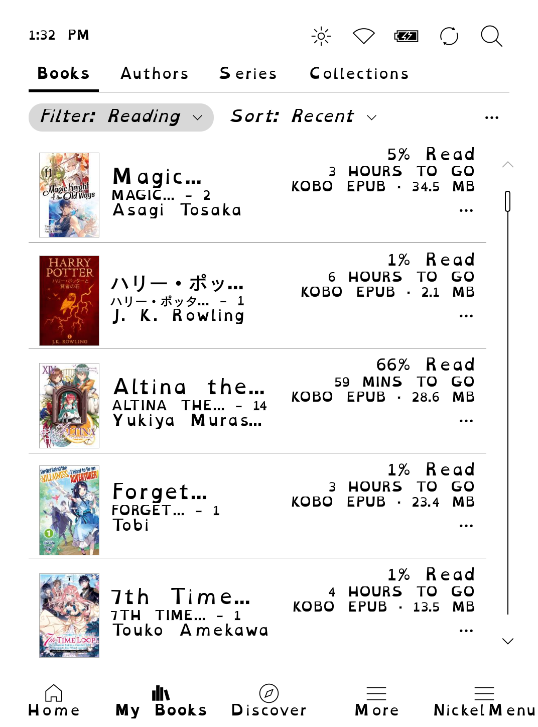 DyslexicMode=true A caveat is that you need to have the OpenDyslexic font in your system partition (i.e. /usr/local/Trolltech/blahblahblah). If you deleted it or only have a copy in /mnt/onboard/fonts, it won't work (although I wonder if a patch could be made to change the file path it looks for the font at; I assume it's hardcoded). The good news is that you can drop in the newer r3 version of the rewrite of the font that has extra glyphs and language support and it still works. And (although I haven't tried this myself) if you wanted to have the UI show traditionally unsupported characters like Cyrillic or Vietnamese, I think if you take your favourite font that has that support (ex. Noto Sans) and change the internal font name to OpenDyslexic and replace the stock version with it, it will display that instead. Hopefully, this is a stepping stone to Kobo allowing us to change the UI font officially without having to use patches or internally rename fonts. Last edited by rtiangha; 06-10-2022 at 07:16 PM. Reason: more screenshots |