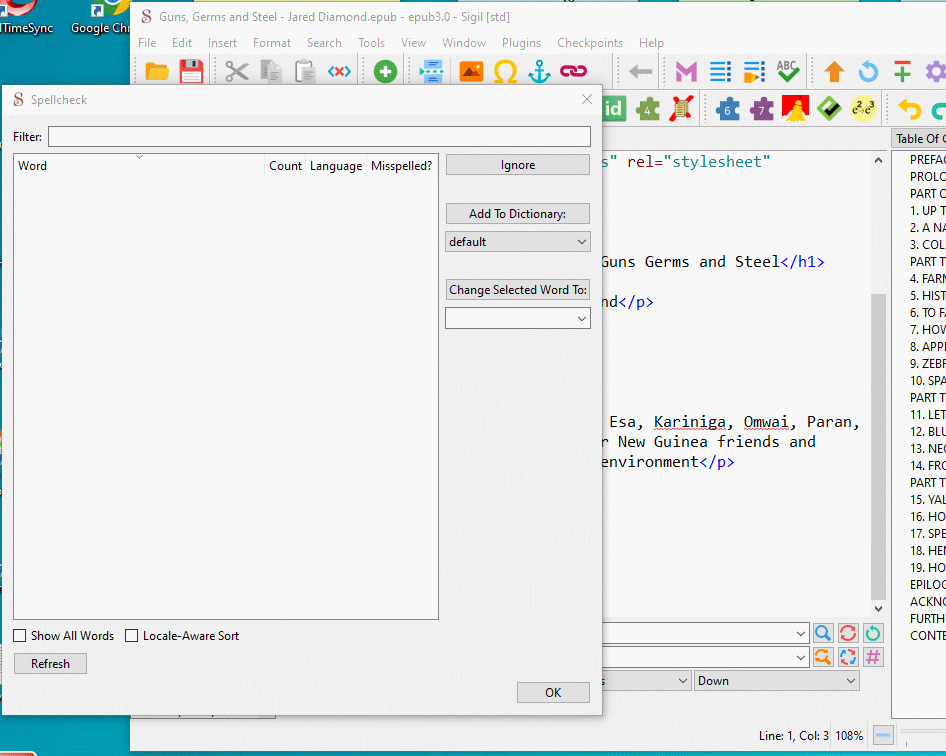 Hello! When trying to run a global Spell Check, i see the first image--background showing that there are spelling errors. If I call to Show All Words, the blank screen fills up--all words marked 'Mispelled? No'.