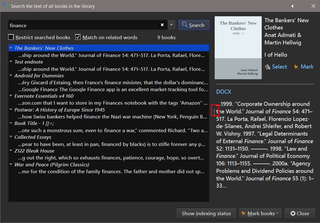 Also, the tooltip indicates that 'restrict searched books' should search all the books currently in view. Instead, it only searches currently selected books. It might also make sense to have a menu option to manually reindex selected books. Last edited by ownedbycats; 06-29-2022 at 06:24 AM. |