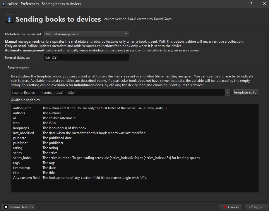 I have to note that I'm using "wireless device communication" option, which gives me the "Send to Device" button when it's connected. I think this is the only way to connect to calibre that lets you search by metadata, but if there's another option for me to try please let me know. Could you elaborate on what settings I need to look at? I can't figure out what I'm doing wrong. |