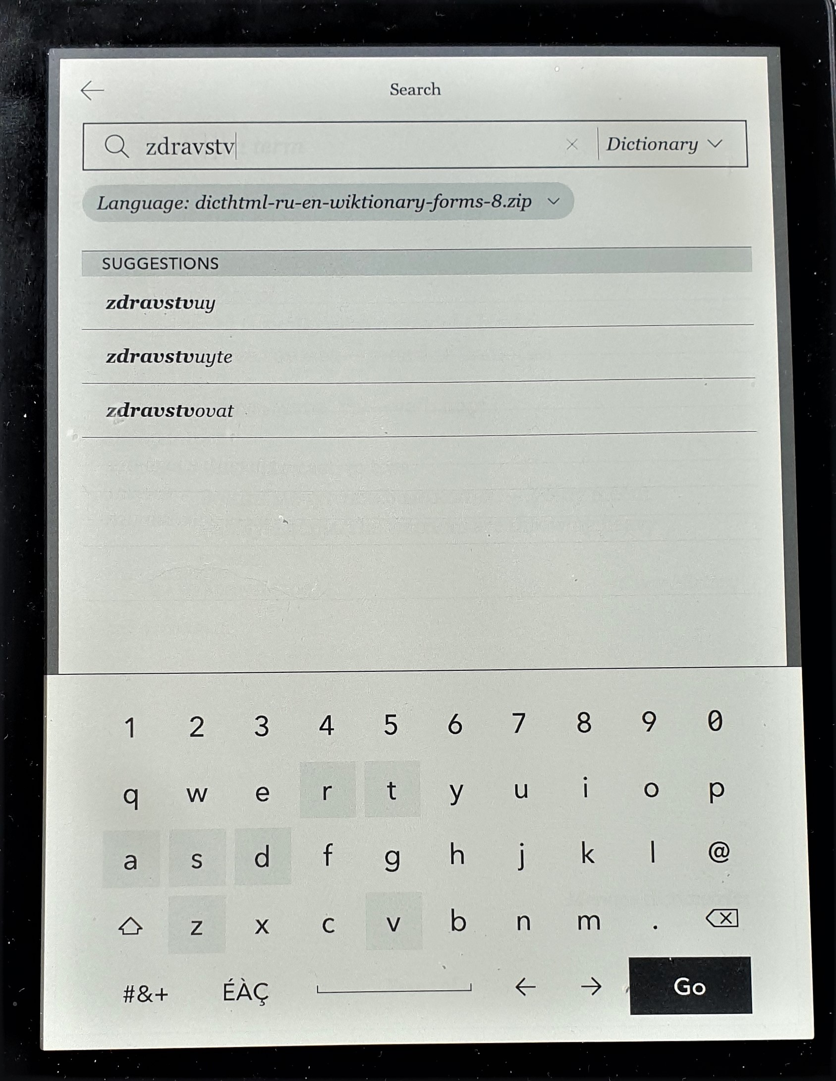 1. Vocabulary: 48 000 words (bigger vocab than ru-en Stardict) 2. Matching forms: 583 000 forms! 3. Shows the form of the selected word, for example, if it is genitive, or instrumental. Past, Future, imperative, participle, etc. 4. Shows the stress accent, so you know how to pronounce 5. Examples, all the great examples from Wiktionary 6. Romanized lookup, so it works great out of the box, without needing to install cyrillic keyboard. This is based on simplified romanization https://en.wikipedia.org/wiki/BGN/PC...ion_of_Russian The file is 26 MB, over the limit of uploads to mobileread. So you can download it over here. Download: https://fastupload.io/IAWQuDH5N0Jz54e Have fun! |