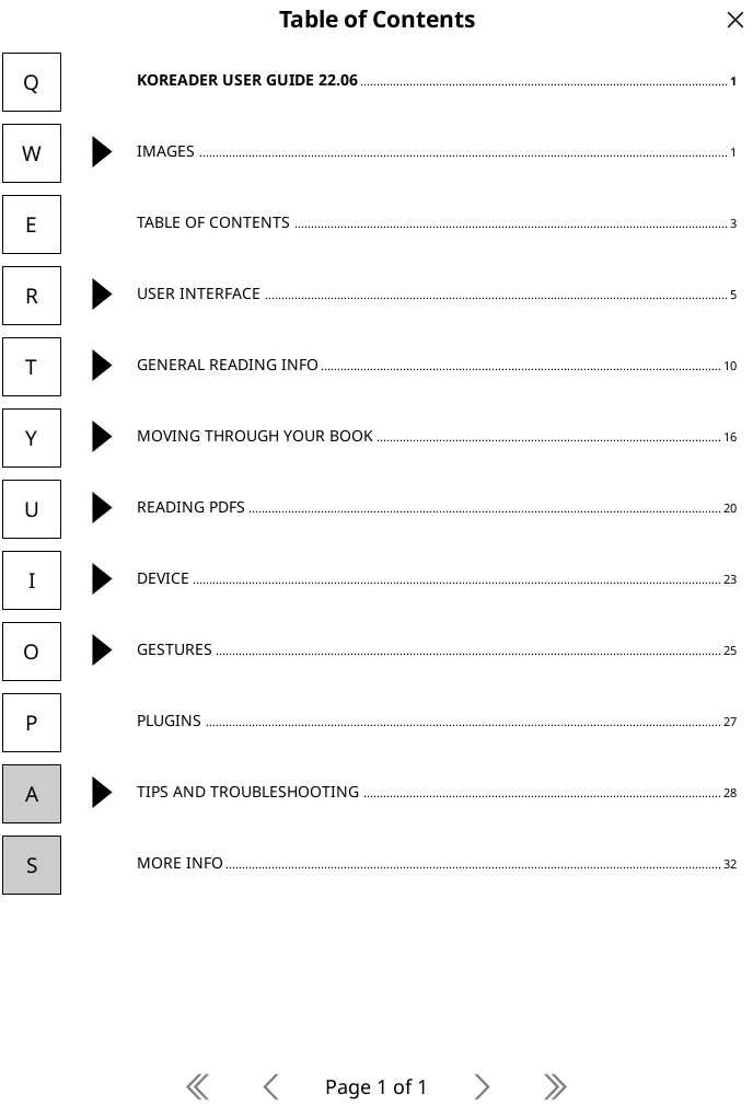 Manually created a TOC (see attached toc.txt) for the new koreader user guide . In addition to the TOC entries made from the section headers, an additional custom tree named 'IMAGES' directly pointing to the pictures of the document was inserted. Following command was used to merge both the pdf and the TOC text file (in Linux): Code: