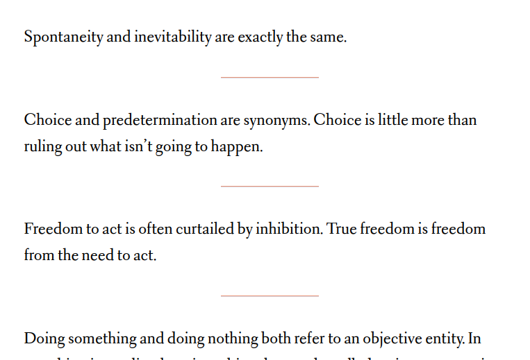 Right, what I’m saying is that I didn’t understand these to be section breaks, as commonly expressed via a rule or fleuron, options dismissed in the opening post. Resolving an issue of semantics for the blind by modifying the original idea to make it more visible is interesting to me, but I’m good with simply celebrating the win.