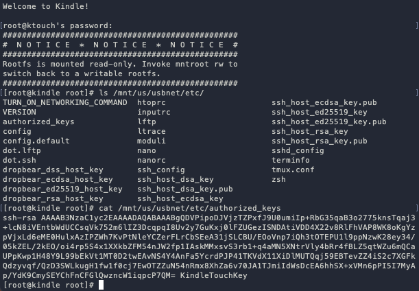 I'm having trouble accessing root without password using ssh-keys. I have followed this guide: (https://www.mobileread.com/forums/sh...d.php?t=204942) Been through the following steps (in reference to guide above), 1. Connected to root@192.168.15.244 (Confirmed kindle time to be set correct). 2. Setup alias (`ktouch`) in `/etc/hosts`. 3. On local machine created ssh-keys using ssh-keygen. 4. Ran `scp ktouch_id_rsa.pub root@ktouch:/mnt/us/usbnet/etc/authorized_keys` copy to kindle. 5. Ran `ssh -l root ktouch` but still asks for password when I try to connect. I've attached how it looks with the .pub key copied over. Not sure what else could be helpful, but do let me know. |