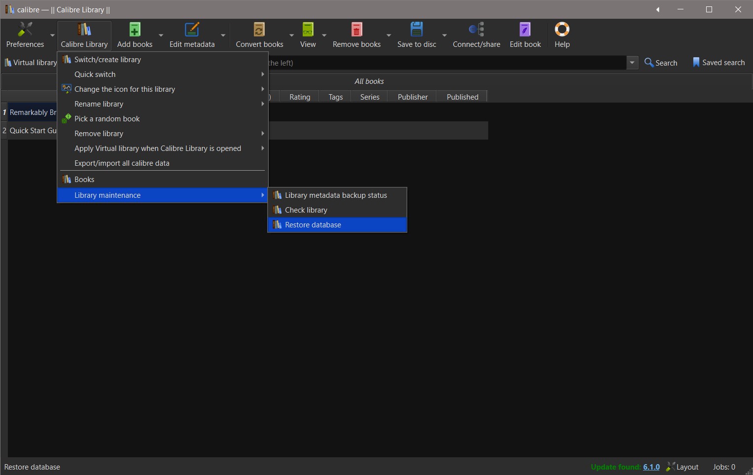 That will reconstruct the database… the metadata.db file in the library folder… from the metadata.opf files… that's why they exist. It will take a while for 7,000 books - watch a movie or have a snooze.