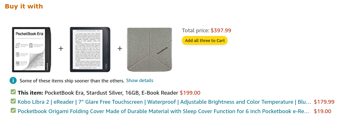 They suggested buying the PocketBook Era with a Kobo Libra 2 and 6" PocketBook Origami cover. I have no idea how the three were supposed to go together. |