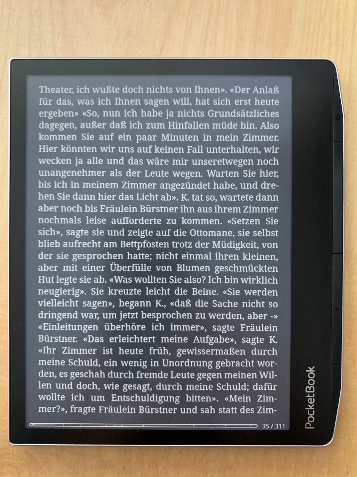 ![]() My Era has a noticable horizontal gradient. I still try to figure out if it bothers me enough to return the device. I know one can adapt to this, but honestly I don't want to. You can't really see it in the photo, but it's there. The next thing I dislike are the artifacts of the previous pages. They are already visible, if only slightly, after one page turn. The G-Sensor is a nightmare. One time it works, the next time it freezes in one position. I disabled it, because it was so annoying. On the good side, page turns with the buttons are very fast. Night mode is possible if you use KoReader. The contrast is also good, but you have to put two devices next to each other to see the benefits of Carta1200. Overall this could be my favourite device, if only the lighting was better. I will spend the rest of the evening with Mr. Steve Hackett on his Seconds Out Tour, I'm sure that will lift my mood.