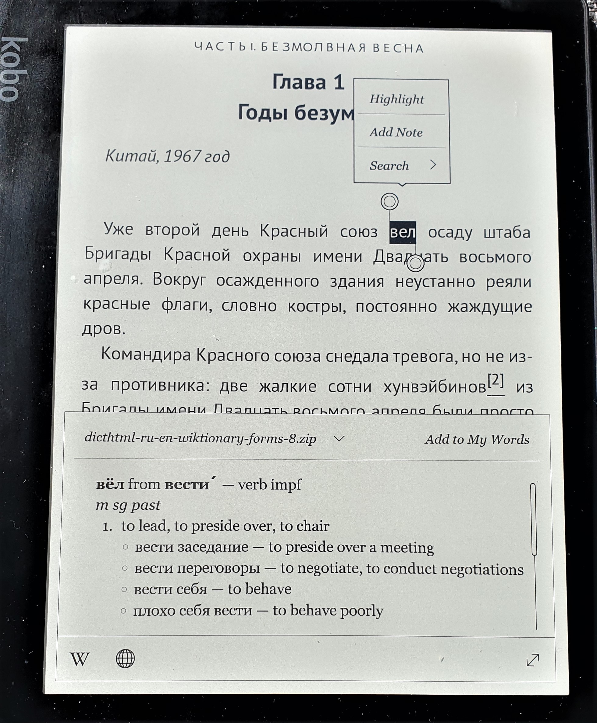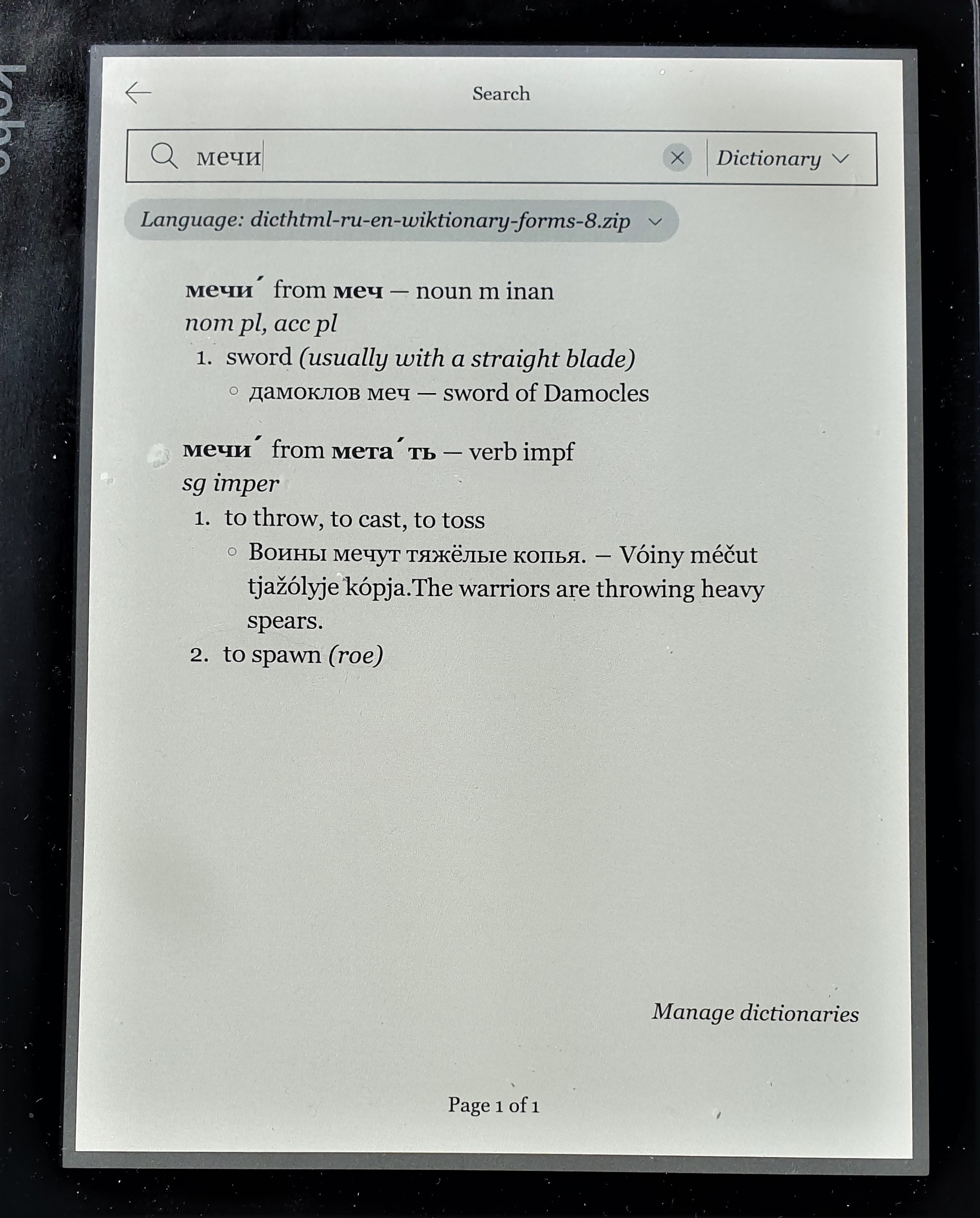 I am very proud to bring a fantastic Ru-En Russian dictionary to the Kobo. Based on the Russian Wiktionary it has several fantastic features: