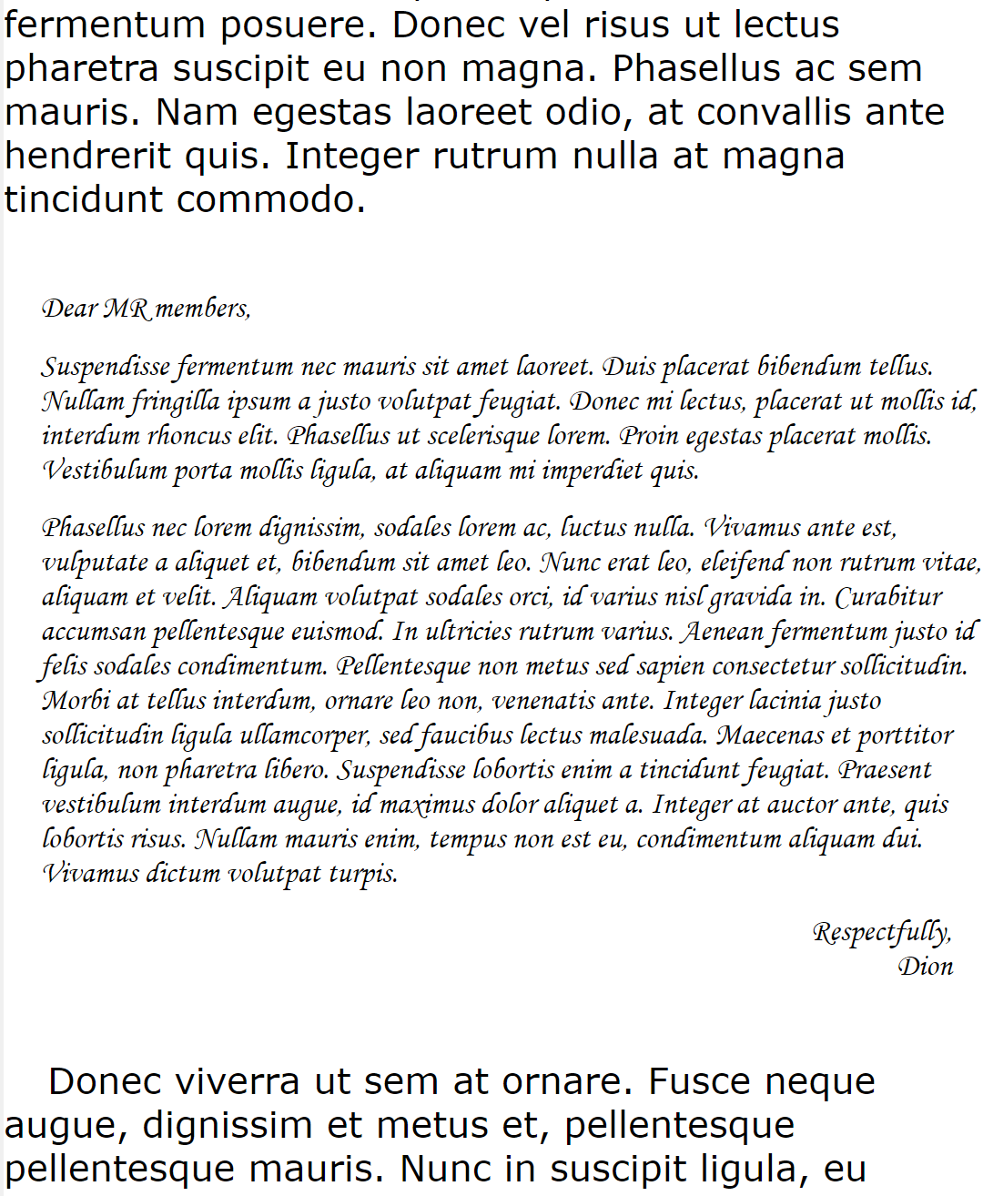 <p>Some normal paragraph.</p> <p>Some normal paragraph.</p> <p>Some normal paragraph.</p> <div class="letter"> <p>A paragraph in the letter.</p> <p>A paragraph in the letter.</p> <p>A paragraph in the letter.</p> <p class="signature">Respectfully,<br/>Dion</p> </div> <p>Some normal paragraph.</p> <p>Some normal paragraph.</p> <p>Some normal paragraph.</p> Obviously you can style the letter however you wish... I would, however, also recommend NOT using <p class="text"> for all your normal paragraphs... simply use the bare <p> tag (with styling in your css like: p {yadda yadda} )...then when you use a class for those special paragraphs it makes it stand out a little more...and it keeps your html nice and clean. Last edited by Turtle91; 07-27-2022 at 08:19 AM. |