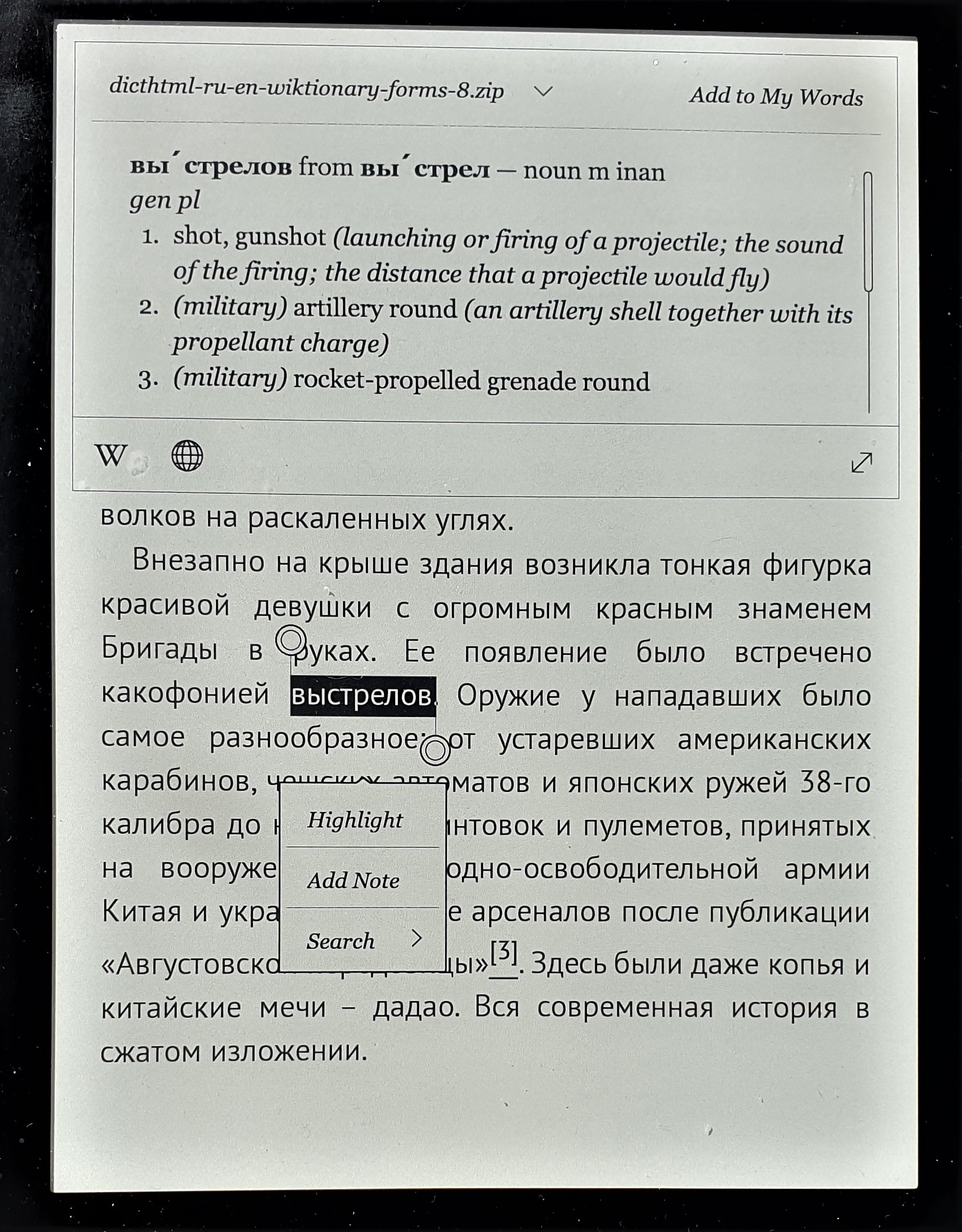 , maybe will share soon) Anyway, this is the new post, if someone can delete the old post...I am very proud to bring a fantastic Ru-En Russian dictionary to the Kobo. Based on the Russian Wiktionary it has several great features: 1. Vocabulary: 48 000 words (bigger vocab than ru-en Stardict) 2. Matching forms: 583 000 forms! 3. Shows the form of the selected word, for example, if it is genitive, or instrumental. Past, Future, imperative, participle, etc. 4. Shows the stress accent, so you know how to pronounce 5. Examples, all the great examples from Wiktionary 6. Romanized lookup, so it works great out of the box, without needing to install cyrillic keyboard. This is based on simplified romanization https://en.wikipedia.org/wiki/BGN/PC...ion_of_Russian The file is 26 MB, over the limit of uploads to mobileread. So you can download it over here. Download: https://translate.gburg.nl/dictionar...y-forms-10.zip Have fun! Last edited by Geert; 07-27-2022 at 01:01 PM. |