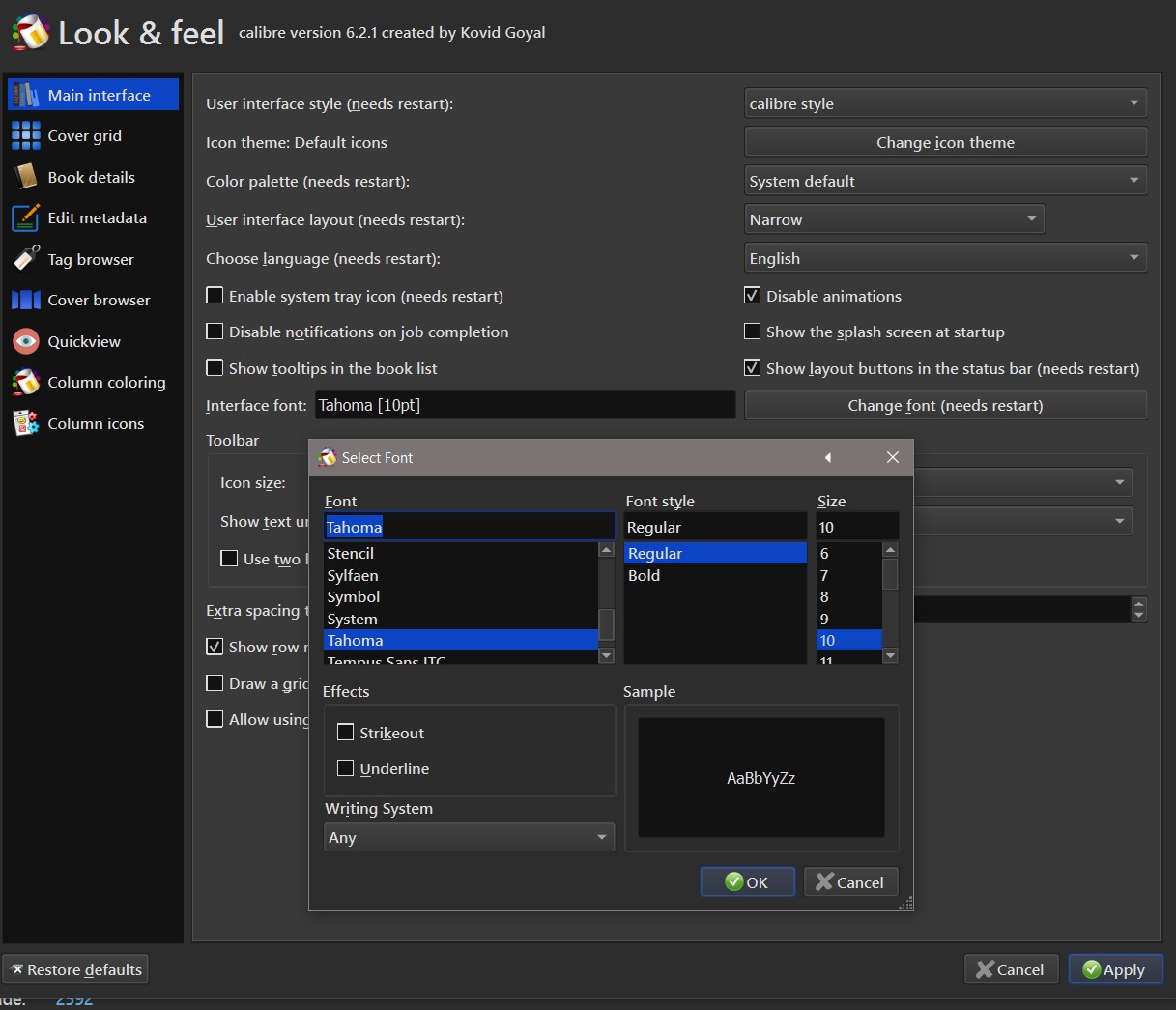 The Font assigned like MS Shell Dlg 2 in my Pc is Tahoma. When I change the font to Tahoma, in the Calibre old version, the font is perfect BUT when I use Tahoma in the new Calibre the font is different and, in the result, I must scroll for see the cover. So, the problem don't is the font but something else that has been changed in the latest version of Calibre