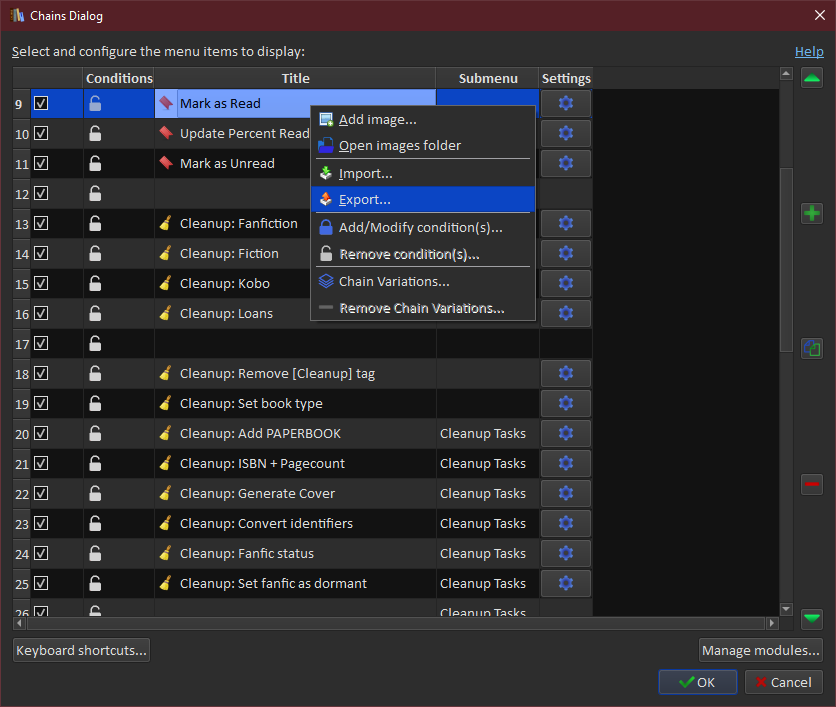 2. Create a new Integer column with the lookup name 'timesread'. 3. (Optional) Create a new date column with the lookup name 'lastread.'* 4. Go to Preferences > Plugins > Get New Plugins and install Action Chains. Make sure to add it to the toolbar or context menu. Restart Calibre. 5. Download the attached file and put it somewhere. 6. Go to Action Chains > Add/Modify Chains. 7. Right-click the main part of the window and use 'Import' to add the downloaded zip file. 8. Test that it works. If it does, it'll open the book, increment #timesread by 1, and set #lastread to the current time. 8. Assign it to a keyboard shortcut. Note that this will not work if you open it in other methods (e.g. the 'view' toolbar button). * If you don't want this, make sure to remove the 'Set #lastread to current date' from the chain before running it. Note that I also set it to activate when one book is selected. This prevents accidentally opening the entire library if you hit the keyboard shortcut by mistake. |
