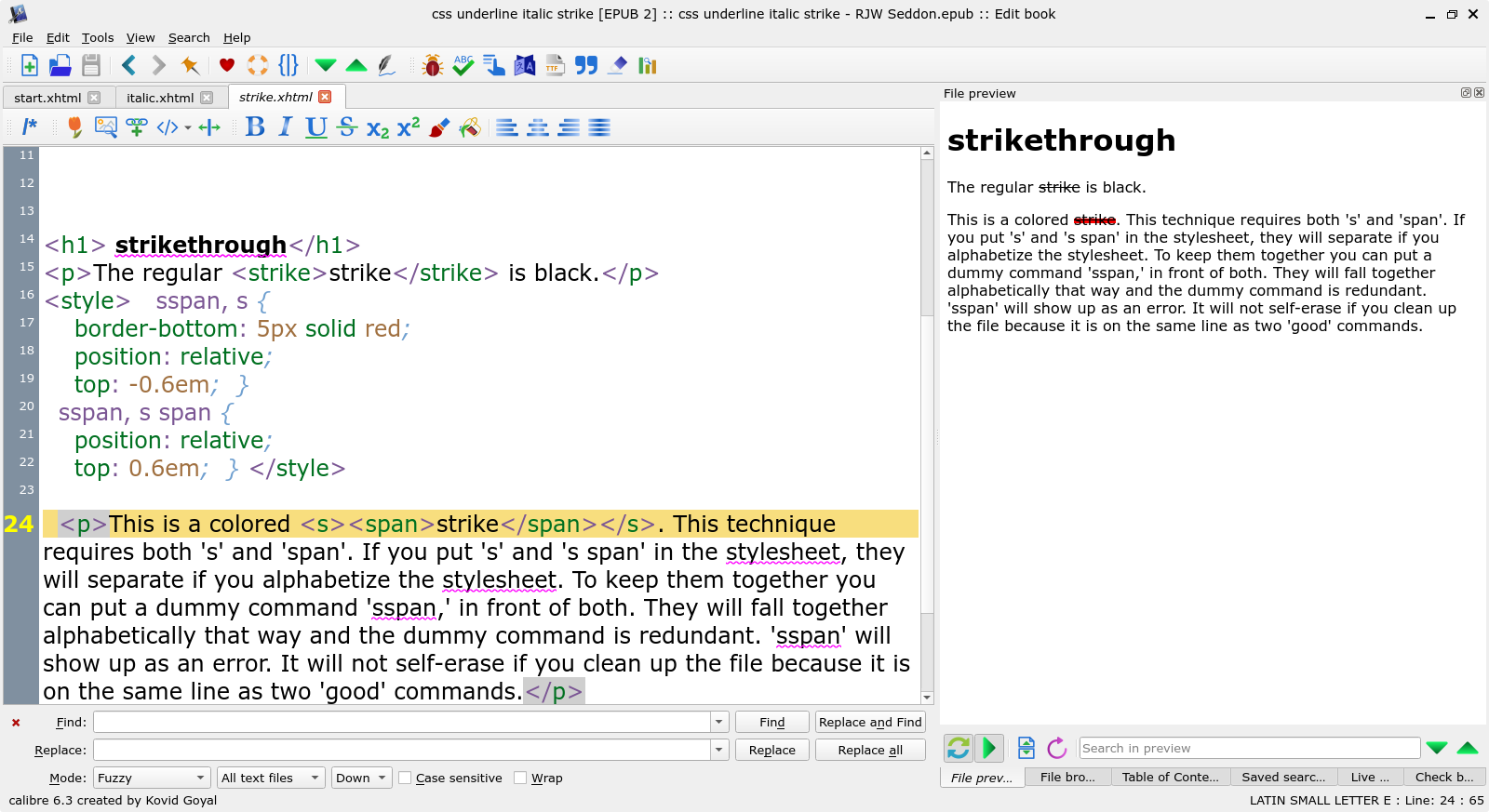 I tested that with classes on a style sheet instead of with styles on the html/body page. It doesn't work on my Kobo Forma as a kepub. I've got test cases for a strike class and for using <del>, <s> and <striike> tags. In none of those on the Forma does the strikethrough line (I guess a border line with your method) get any thicker. In all cases, it's that 1 pixel thick line. Even more interesting, in the cases of the <del>, <s> and <strike> tags, the struck text is actually lowered on the page. But, the strike class (and putting the text-decoration line as a style in the <span>, keeps the struck text in the proper position.