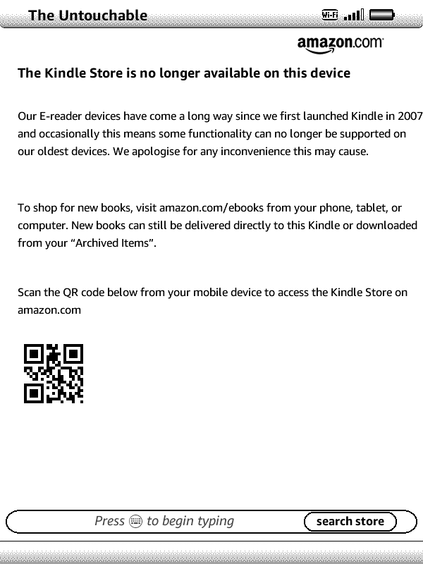 Kindle 2 (International) Kindle DX (International) Kindle 3 (aka Kindle Keyboard) Kindle 4 (aka K4NT) After the servers shut down later today, you will still be able to download books, doing so via "View Archived Items" and having books delivered to one of these devices on Amazon's website. ![]() Look at https://www.amazon.com/OldKindleFAQ for more information. I also went through the extra effort of taking screenshots of the end of support messages, as seen on my Kindle 4 (Black), but they exceed the forum's image size rules. ![]() Edit: It has officially shut down now. Edit 2: I have added the screenshots as attachments. Last edited by Badcatalex; 08-17-2022 at 06:51 PM. Reason: IT SHUT DOWN AT 1:30 PM CENTRAL TIME OR SO |