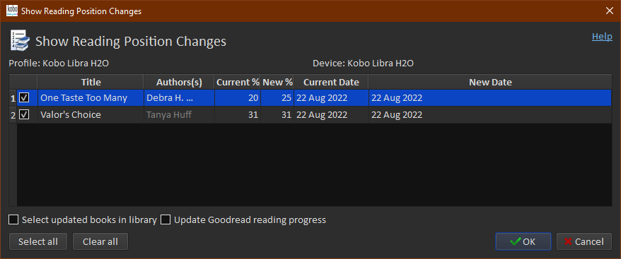While fetching reading status with 'prompt to store,' I unchecked one of the books (opened by mistake). However, it stored the new reading date anyways. I'm hoping I just misclicked and re-checked it, but it's also possible that all the changes to Calibre broke it. Last edited by ownedbycats; 08-21-2022 at 03:02 PM. |