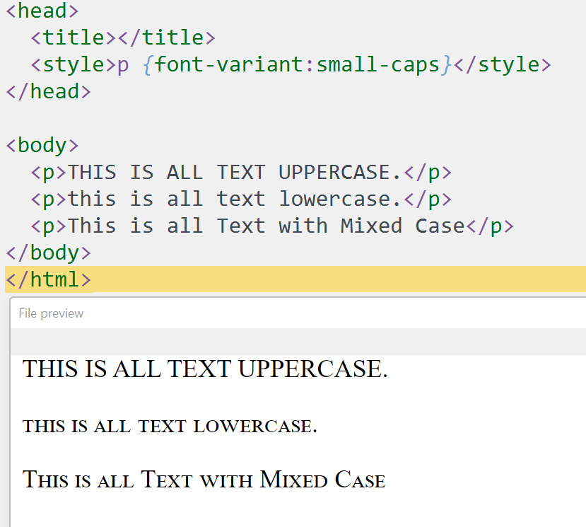@Turtle91 your samples are correct. The all uppercase is all uppercase. The all lowercase is in smallcaps. The text with the mixed case is both uppercase and smallcaps. That why I put text-transform: lowercase; in the CSS because if the text is originally using a simulated smallcaps, it's going to be all uppercase.