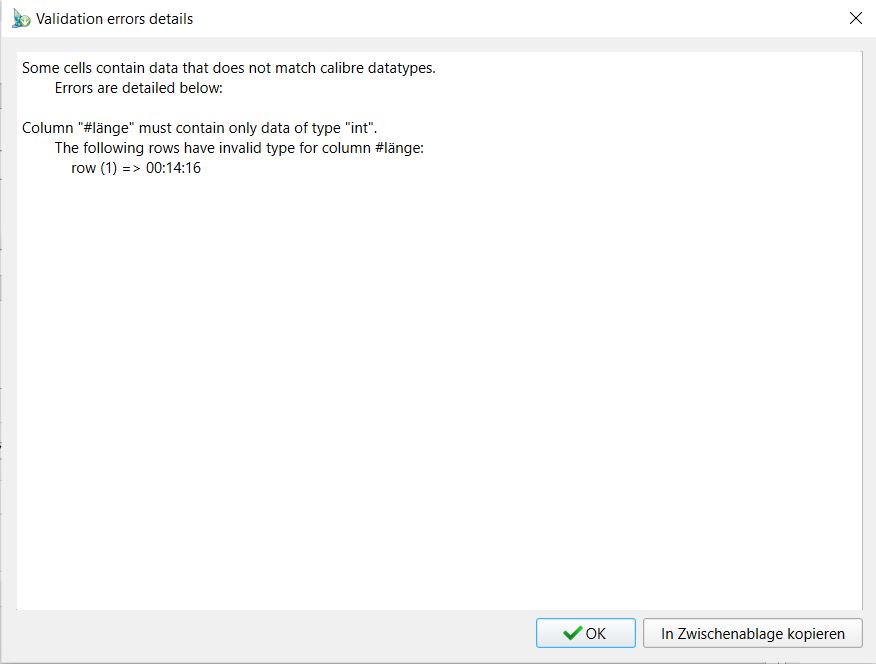 ich verwalte mit Calibre Videos! Nun würde ich gerne die Metadaten aus den Videos, in entsprechend zu erstellende "Eigene Spalten", mit "Import List" importieren. In einem ersten Schritt habe ich dazu versucht eine Eigene Spalte für die Länge des Videos zu erstellen und zu importieren. Die Metadaten aus den Videos liegen mir als csv-Datei vor. Beispiel: "Name","Author","Length" "Beispieltitel","TestAutor","00:14:16" Hier die eigentliche Frage: Wie muss die "Eigene Spalte": "länge" des Videos formatiert sein damit der Import funktioniert? Beim Importversuch erhalte ich die Fehlermeldung: Column "#länge" must contain only data of type "int". The following rows have invalid type for column #länge: row (1) => 00:14:16 Vielen Dank |