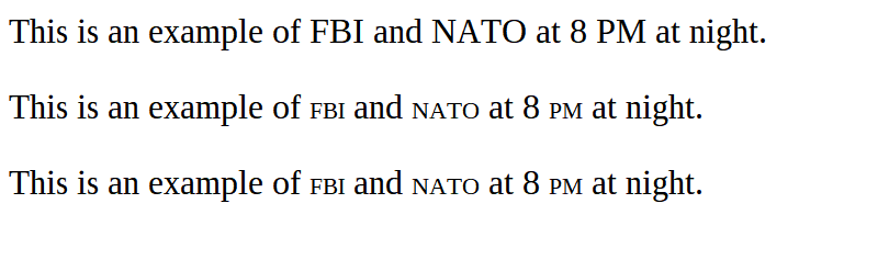 And, yes Jon, the normal caveats about the app/device supporting the functionality still apply... When I come across text that is written in ALL CAPS and I want to display them using small-caps, I take the little bit of extra time to convert the ALL CAPS to either all lowercase or, most often, mixed case I don't leave them as ALL CAPS and then do a double transform in the CSS and add all those additional <span>s....it's just cleaner coding and makes the html easily readable. As always, you can do it however you want to. I just have to interrupt when you say people MUST do it your way. Cheers, Last edited by Turtle91; 09-14-2022 at 07:31 PM. |